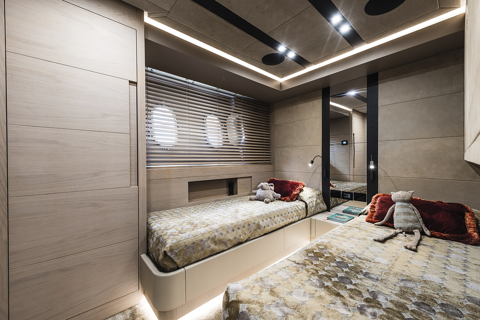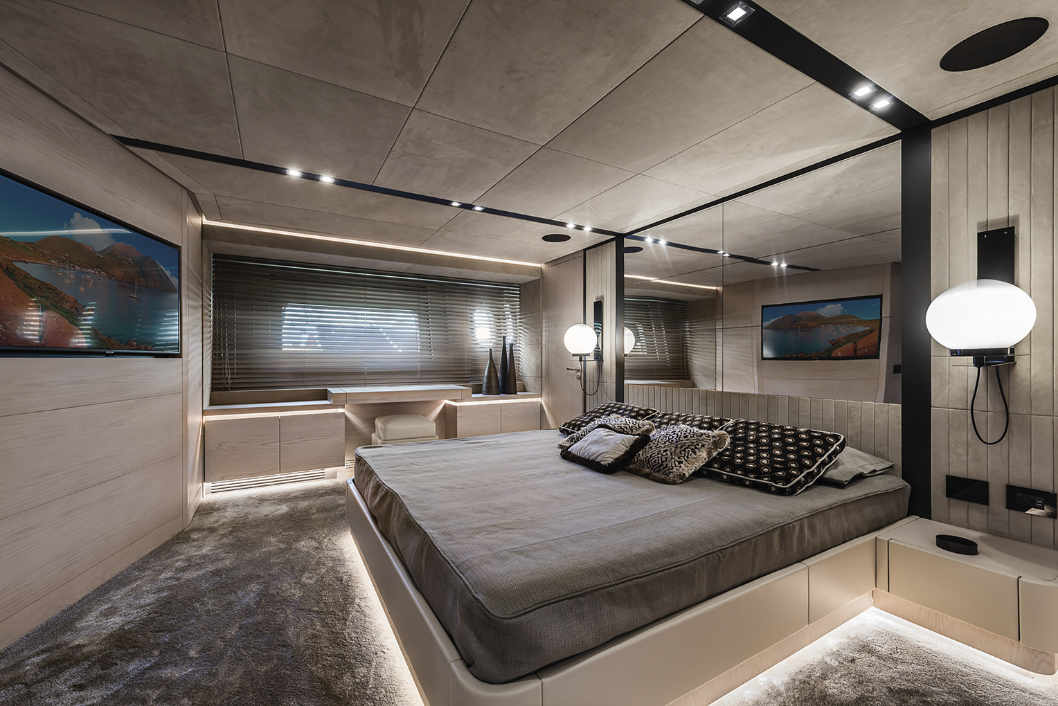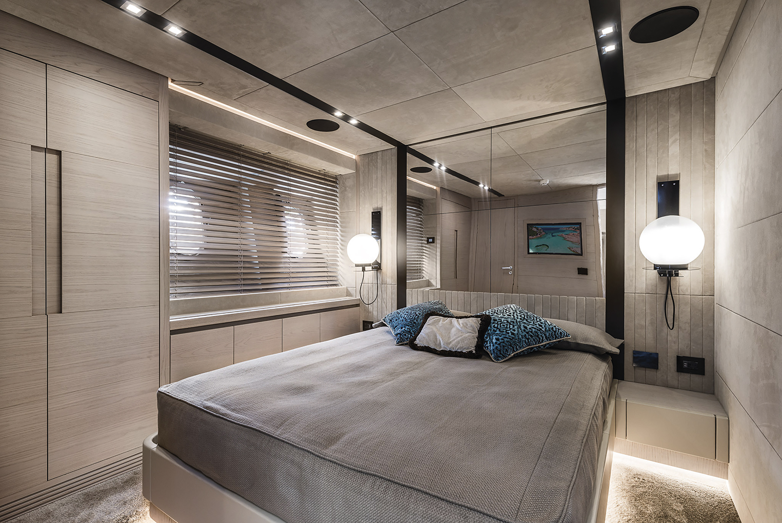 The galley which is well equipped to satisfy any discerning chef’s needs as well as the owner’s quarters which comprise two double cabins and two twins are situated below deck. The first of these reveals a king size bed measuring two by two metres which is beyond standard but was owner requested, a sofa, a dressing table and a walk in wardrobe. The huge bed’s elegant headboard stands out for its soft Nubuck textile lining which rises as far as the ceiling to frame four large mirror panels. The same solution is to be found in the other cabins as well.