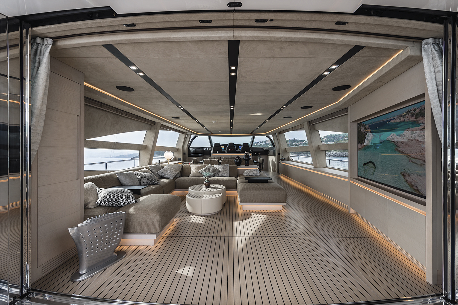 The main deck’s layout offers a bright open space which includes the main living area which is furnished with an outstanding sofa, “chaise longues” as well as a 75” television set, a dining area with a seating capacity of ten around a teak slatted table. The raised helm controls station is decorated with coffee coloured non reflecting skin to maintain top visibility through the windshield.