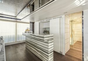 They are made up of a private gym packed with Technogym gear placed just before the entrance to the master suite which is lined with wardrobes, where the height of the ceilings is exceptional. Next to this, moving forward toward the bow there’s a full beam bathroom.