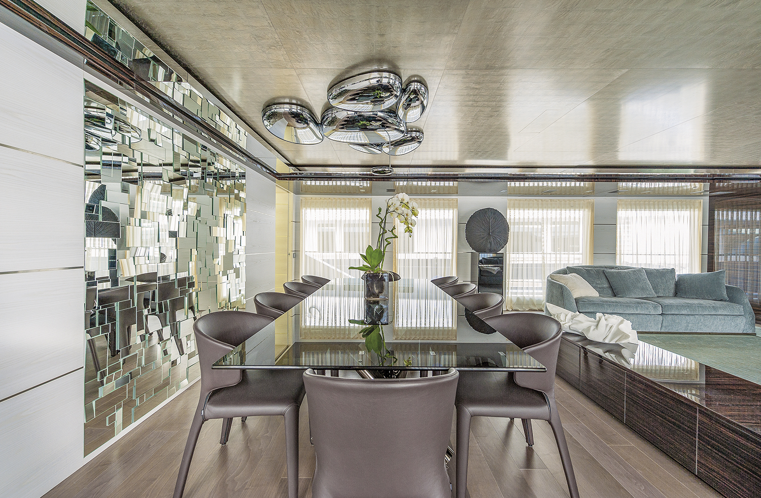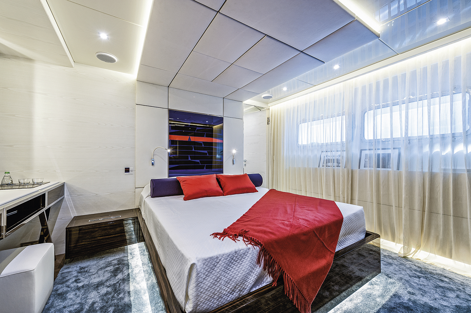 The walk around deck area complies to class norms and has no cumbersome screen towards the bow. The main saloon sports four floor to ceiling window panels which make it outstandingly bright and convey the same feeling a loft style apartment van convey. Even though the engine room’s air vent columns rise up on each side of the main saloon they have little impact as they are neatly concealed behind cut glass panels – next to one of which there’s an upright piano – and the sense of continuity with the exterior is guaranteed by cut glass sliding doors which open towards the stern end of the deck. The owner’s quarters extend over an area of about 80 square metres.