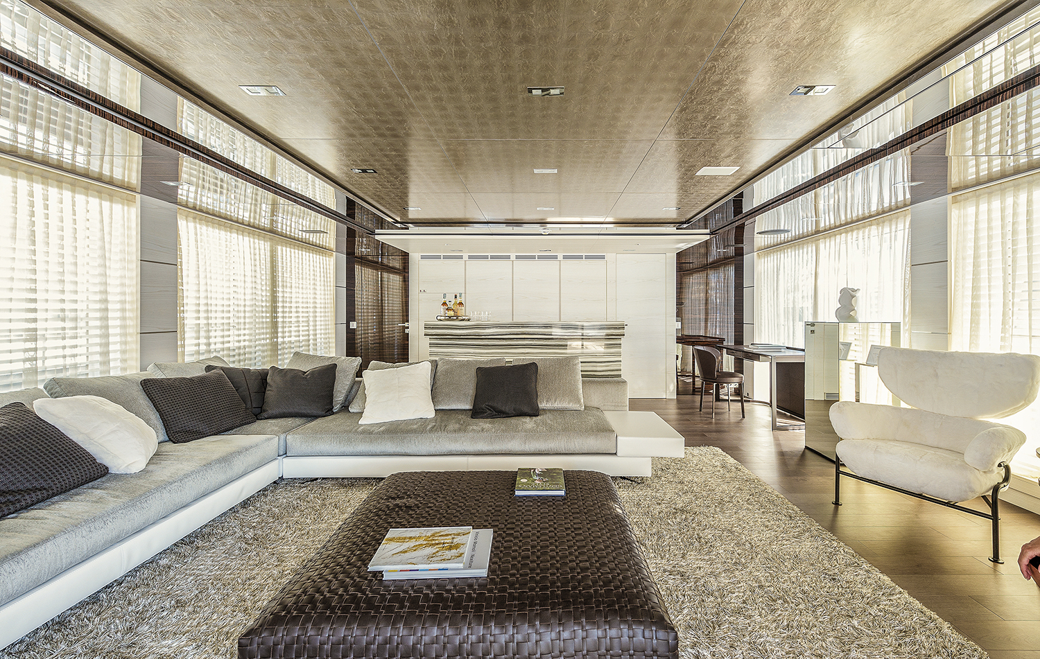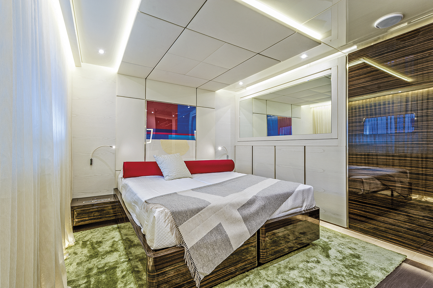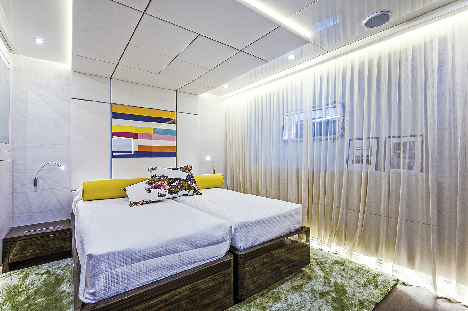 The owner’s request in this context was quite clear, he wanted a clear division and no sense of continuity between interiors and exteriors in the area, but spaces which would mirror his healthy sporty life style. To this end, right next to the fully equipped gym, there’s a Turkish bath which can also be easily accessed by the owners’ guests. Access to the guest quarters along the lower deck is via a lightweight staircase with cut glass panelling. They are made up of two double cabins toward the bow and two twins amidships. Each one differs from another expressing different themes. The saloon on the upper deck sporting plenty of natural light with four large window panels gives the same sense of space found below.