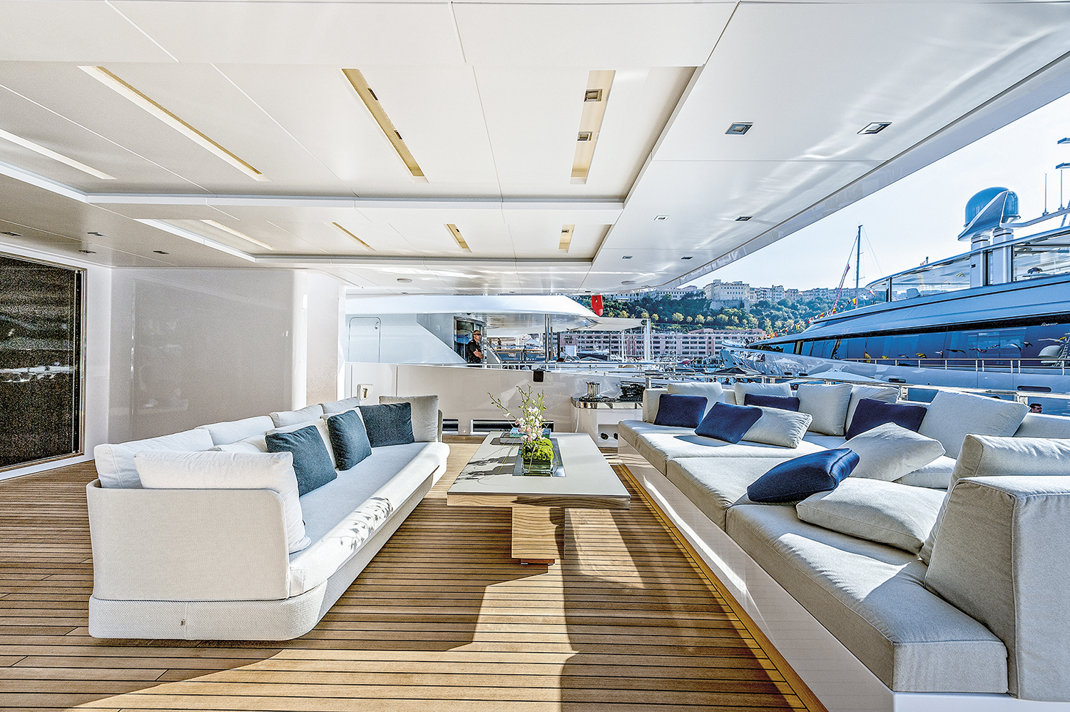 There’s more additional space reserved to guests in the bow area of this deck, which doubles as sun bathing area and also an area containing a crane, with which to manoeuvre tenders and the access to an emergency backup generator stored out of sight, inside a specially designed recess. The stern area too sports an intelligent layout.