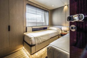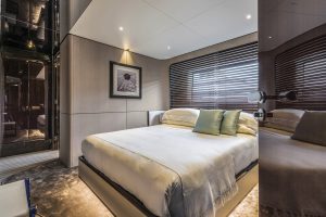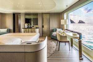 The layout of some of the furniture is original beginning with a large sofa situated at the centre of the main saloon which is contoured by self standing ornamental elements which do not interfere with bulkheads and floor to ceiling window like ports. The bow section along the main deck hosts the owner’s grand suite. The bed which is placed at centre conveys a sense of airy lightness to the whole ensemble while the private terrace captures some of the lion’s share, thanks to a refined mechanism, a portion of the floor to ceiling window like port descends vertically to the toe rail level, as the terrace floor slides out from under the suite’s flooring with pop up protective stanchions creating an instant balcony overlooking the sea.