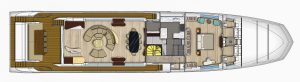 Much attention has been given to external spaces as well, for these comprise a 30 square metre lounge in the bow area furnished with sofas, sun pads galore, and a hydro-massage tub. A 12 square metre beach club area with a pivoting platform can be enjoyed by moving the 5 metre tender and jet ski to one side of the garage.