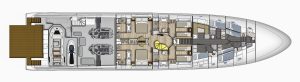 Moving amidships we come to a large lobby featuring a helical shaped stairway enriched by slim backlit onyx steps flanked with lacquered white and mother of pearl sides which lead to the lower deck hosting two VIP suites and two guest cabins with bathroom while the crew’s quarters are clearly separated from the guests’ lodgings and are accessed via a separate entrance in the bow.