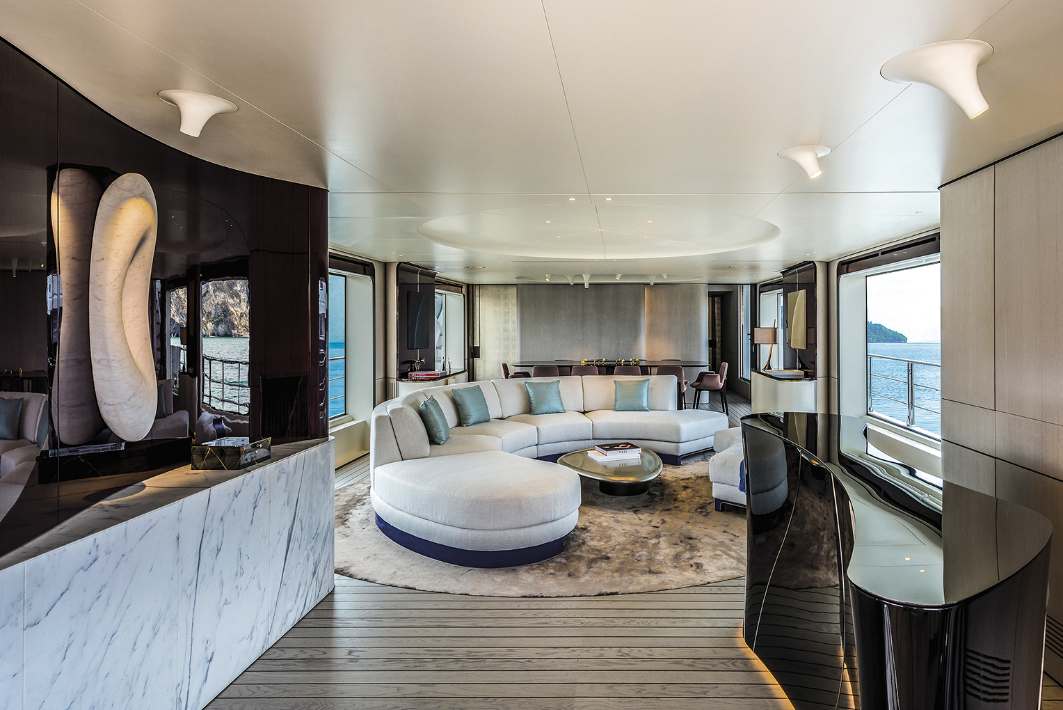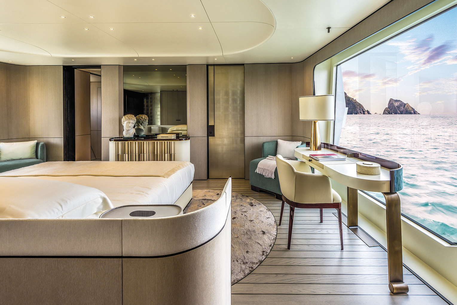 The layout of some of the furniture is original beginning with a large sofa situated at the centre of the main saloon which is contoured by self standing ornamental elements which do not interfere with bulkheads and floor to ceiling window like ports. The bow section along the main deck hosts the owner’s grand suite. The bed which is placed at centre conveys a sense of airy lightness to the whole ensemble while the private terrace captures some of the lion’s share, thanks to a refined mechanism, a portion of the floor to ceiling window like port descends vertically to the toe rail level, as the terrace floor slides out from under the suite’s flooring with pop up protective stanchions creating an instant balcony overlooking the sea.