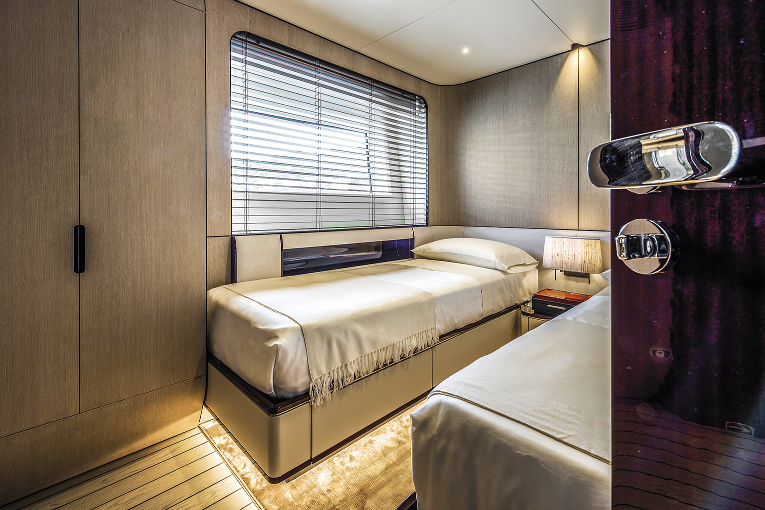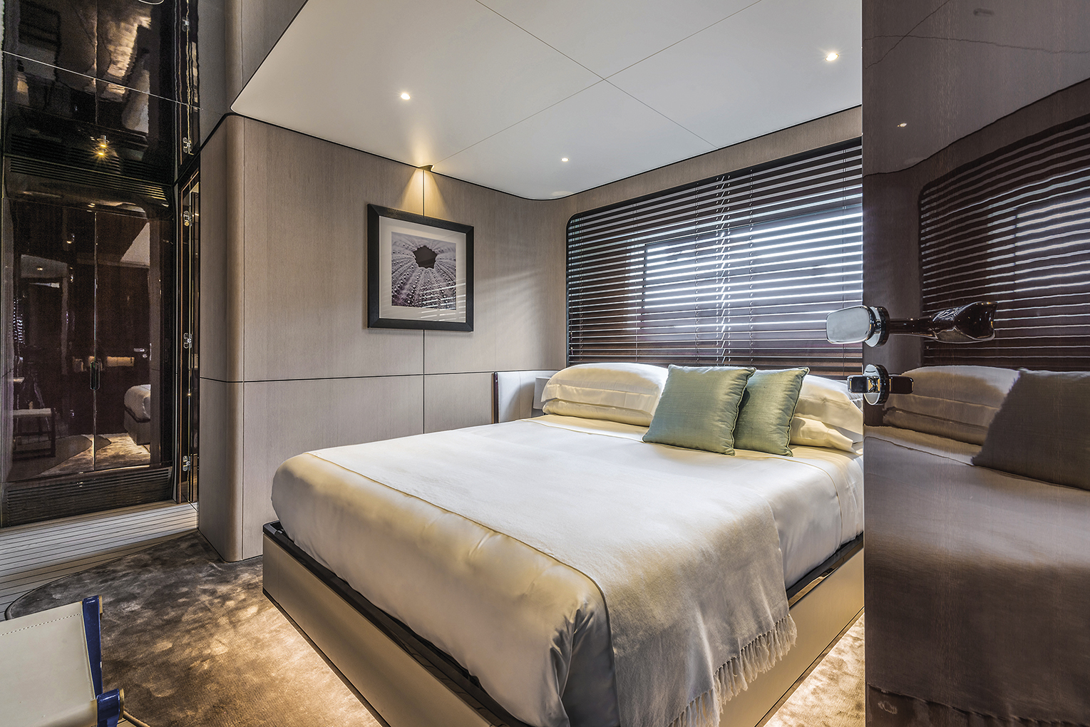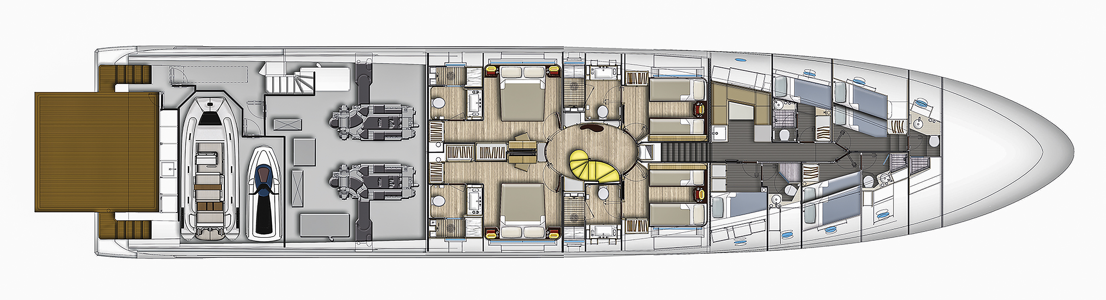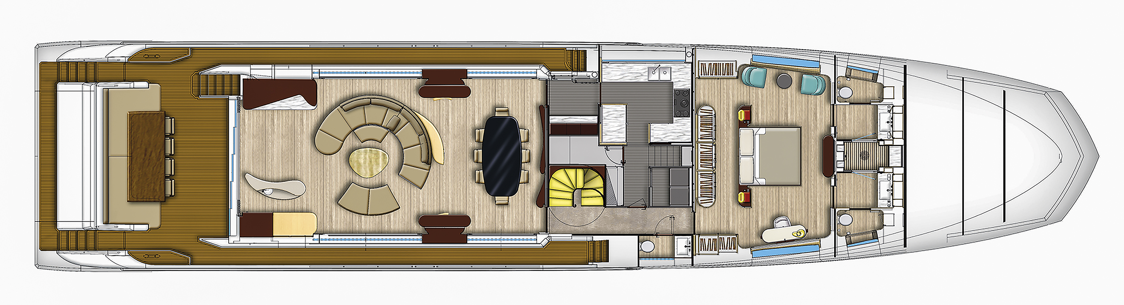 Much attention has been given to external spaces as well, for these comprise a 30 square metre lounge in the bow area furnished with sofas, sun pads galore, and a hydro-massage tub. A 12 square metre beach club area with a pivoting platform can be enjoyed by moving the 5 metre tender and jet ski to one side of the garage.