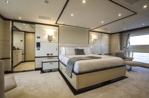 The interiors were drawn up by Redman Whiteley Dixon with the yard’s team. Three options are available for the Fast 125’ models beginning with the “Air” configuration. In the case in point the owner a discerning yachtsman with plenty of experience, specially requested furniture from known designer brands among which we find Glyn Peter Machin, Sutherland, Minotti and Meridiani. Thanks to the Fast 125’s semi-wide body configuration, the owner’s suite situated in the bow area of the main deck runs full beam across with two terraces opening on each of the two sides. The result is an airy well lit interior with a panoramic view of the surroundings.