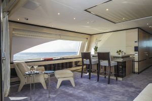 Finally we come to the sun deck proper which is equipped with a bar section and stools, two L shaped settees and a dining zone with made to measure elements by Minotti.