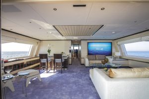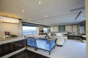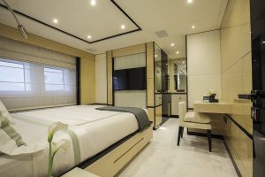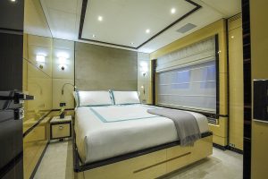 The interior decor features contemporary design styling, with clean even plain lines which underscore precious materials and fabrics adding sober elegance to every area. The entire layout has been devised to welcome and host up to ten guests in five cabins. These in addition to the owner’s suite, comprise three doubles, a twin into which a third bed can be installed. The crew cabins can host up to seven crew in four cabins, thereby offering guests detailed service and enhanced attention. Guest cabins and crew’s quarters are situated along the lower deck.