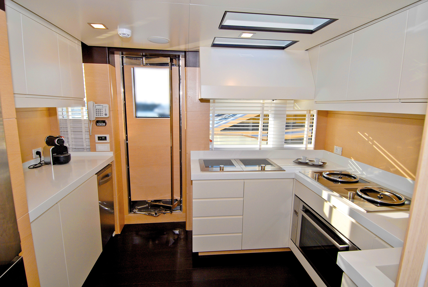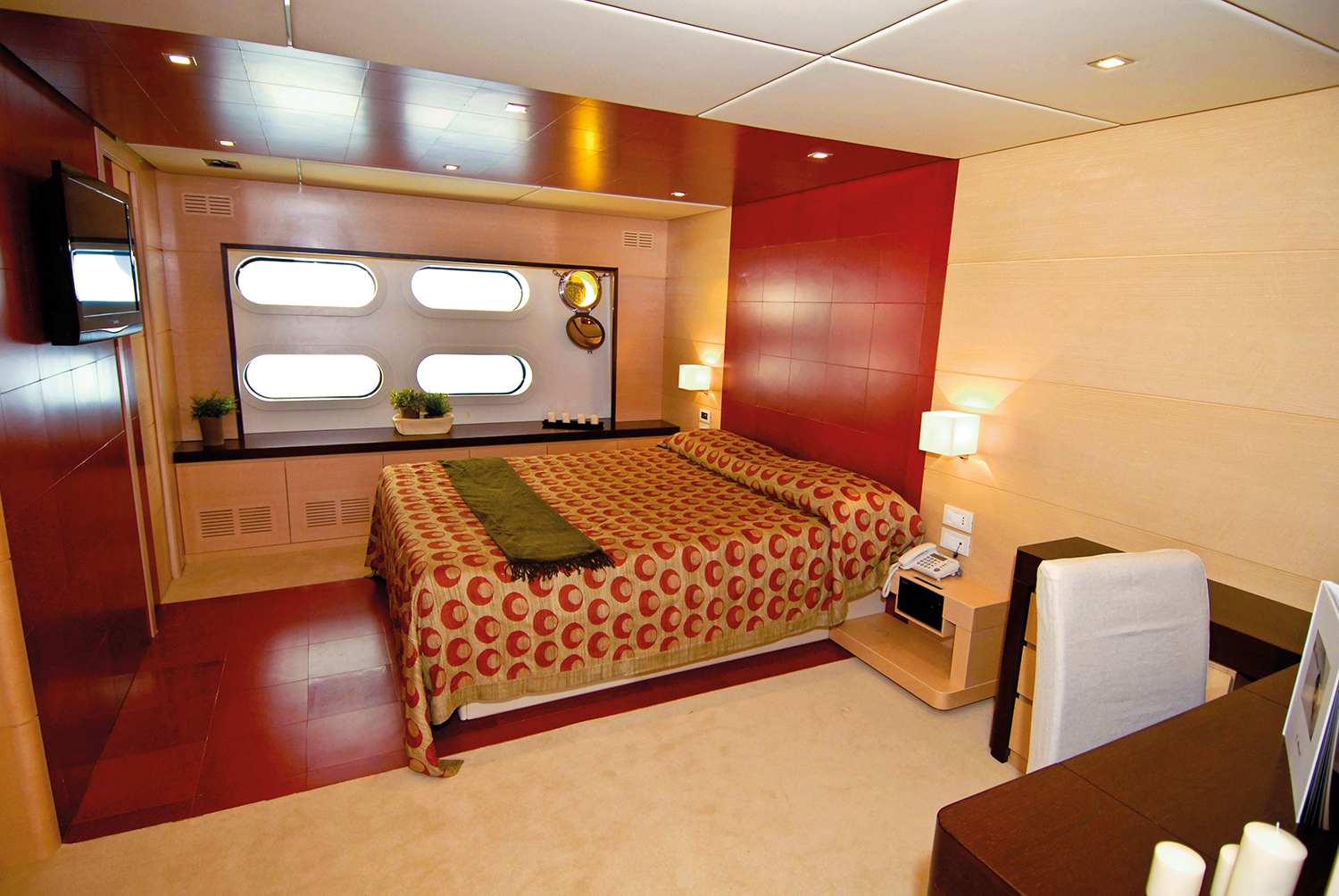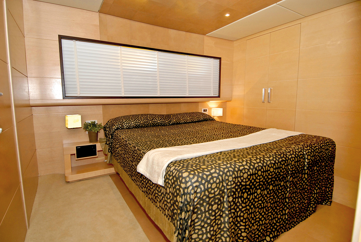 Descending from the main deck one accesses the night quarters featuring five cabins with private bathroom situated along a wide corridor. Each cabin sports a thick leather band of a different colour that runs along the perimeter of each cabin above the top of the bed area offering a pleasing contrast between ceiling and floor which is covered with cream coloured carpeting.