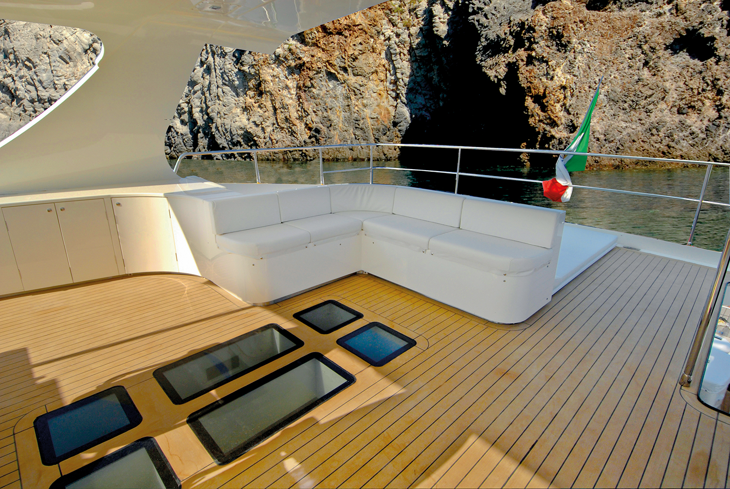 The owner’s bathroom is as large as a cabin, it hosts a shower stand which is 1.70 metres long while the WC / bidet are situated in a separate space away from the shower. The whole of the bathroom is bright thanks to four oval windowpanels set along the sides which have become C. Boat’s yard main feature. The other cabins too sport a pleasant leather and carpeting mix, generous wardrobes, and bathrooms with shower cabinets and bidets.