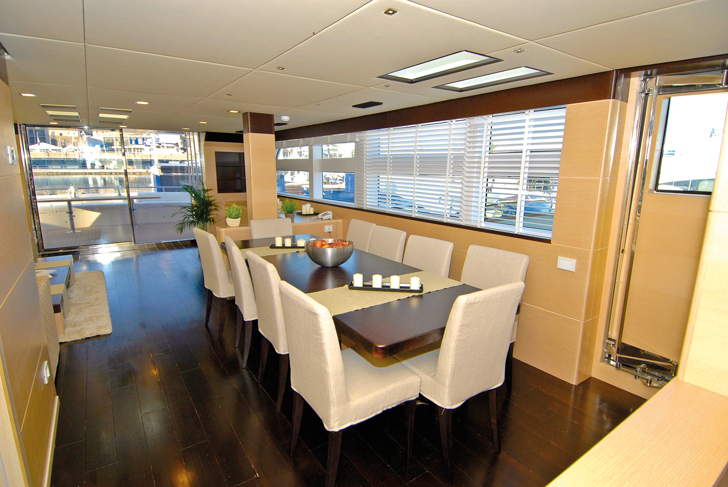 The interiors thanks also to the noteable beam (of more than 7.40 metres) which enhances the sense of space while substantial window panelling also on the coachroof offers plenty of natural light to the saloon, its adjacent areas and a remarkable sky view. Custom made embellishing whitened English oak is deployed below while the floor is in wenge wood. A high degree of liveability as well as comfort are guaranteed throughout this yacht. The dining area towards the stern hosts a table with a seating capacity of ten and a ‘C’ shaped sofa opposite.