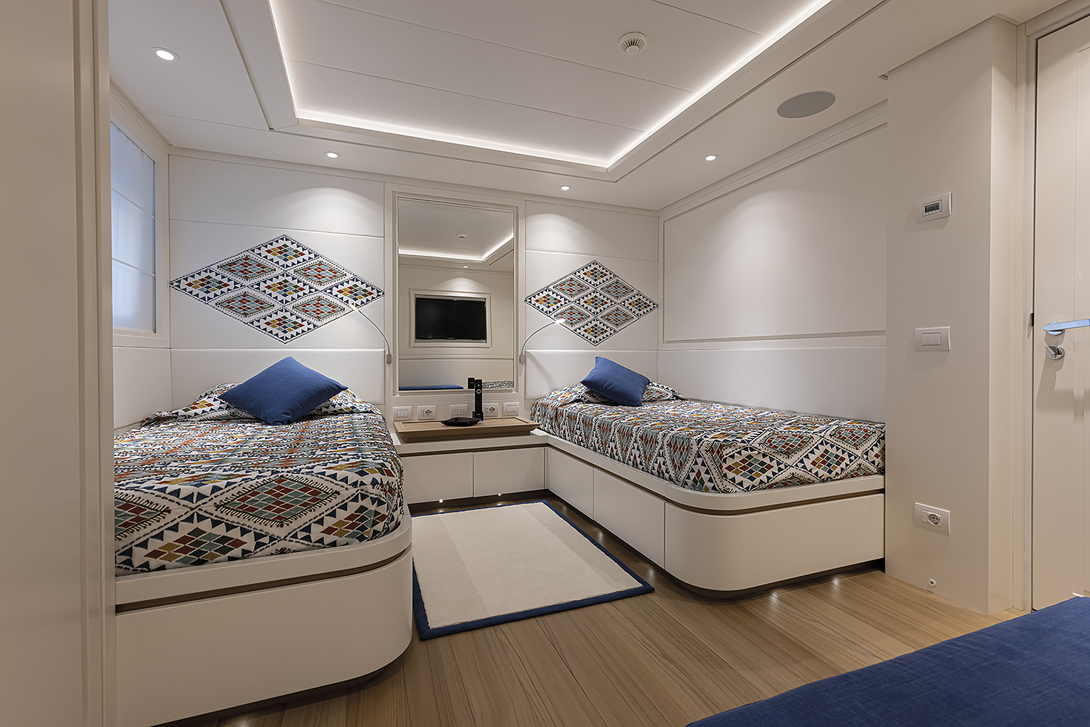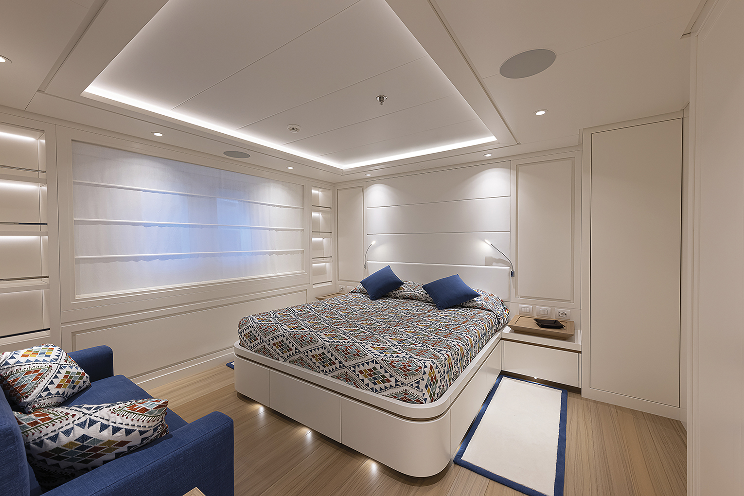 In this more subdued version “Framura” offers great on board comfort offering guests elegant and welcoming surroundings and atmosphere thanks to the owner’s architect of choice. The interiors feature sober classic coloured patterns which without being dull are relaxing and bright. The yacht’s cruising range is expected to be of approximately 5,000 nautical miles at 12 knots. “Framura” sports a lovely owner suite on the main deck, a VIP suite and four guest cabins situated along the lower deck. Both living rooms are bright with natural light. A formal one is situated along the main deck, comprising a bar, dining area and a sea view lounge along the upper deck and movie theatre, coffee and gaming tables.