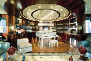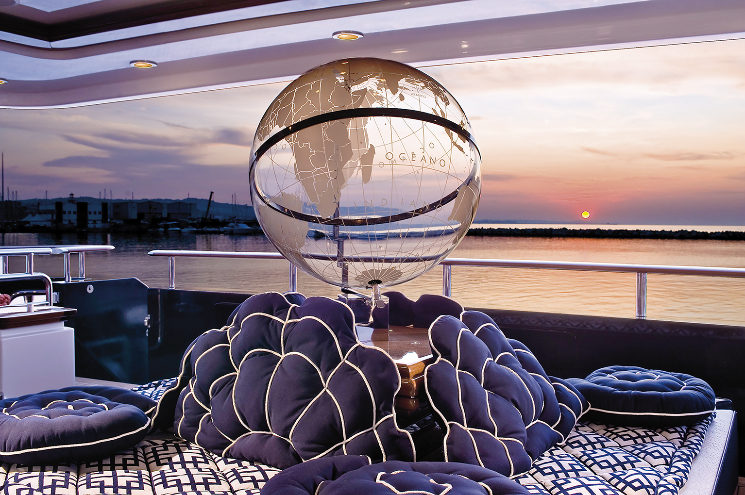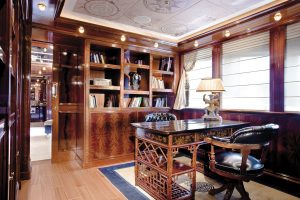 The underlining theme of the project was travel, somewhat obviously expressed by works of art such as the glass world globe set at centre cockpit. Blue Eyes was conceived for her owners’ pleasure, to just embark upon that ‘ideal’ cruise each have inside even if at anchor. Hence, we were not at all surprised to find a large semi-circular book case and piano at centre, greeting us as we walked into the saloon of the main deck.