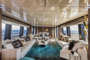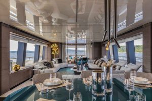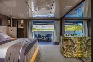 The first unit presented at the Cannes and Monaco Yachts Shows in 2018 sported fine fabrics in dark colours namely walnut and oak which were coupled harmoniously with grey and beige hues and petrol green finishes. The ceilings were specially lacquered to contrast, with the steel bronze details of the door handles and grab rails and the reflecting steel finishes of the doors.