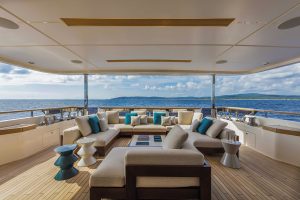 By comparison the sun deck above is 18 metres long and sports a surface area of 92 square metres in which there are 4 distinct and customizable areas. The first model was set up as follows: From the stern section of this deck a fully equipped sun bathing platform, then proceeding forwards a convivial area with sofas and seats by Roda shaded by a hard top forward of which we come to a dining area with a bar cabinet and pool area.