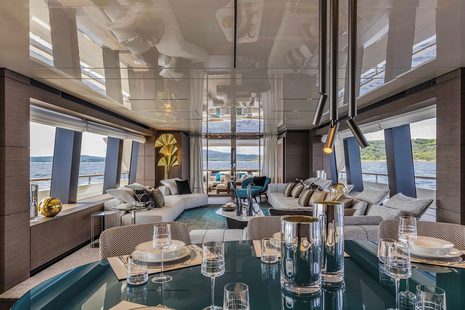 The first unit presented at the Cannes and Monaco Yachts Shows in 2018 sported fine fabrics in dark colours namely walnut and oak which were coupled harmoniously with grey and beige hues and petrol green finishes. The ceilings were specially lacquered to contrast, with the steel bronze details of the door handles and grab rails and the reflecting steel finishes of the doors.