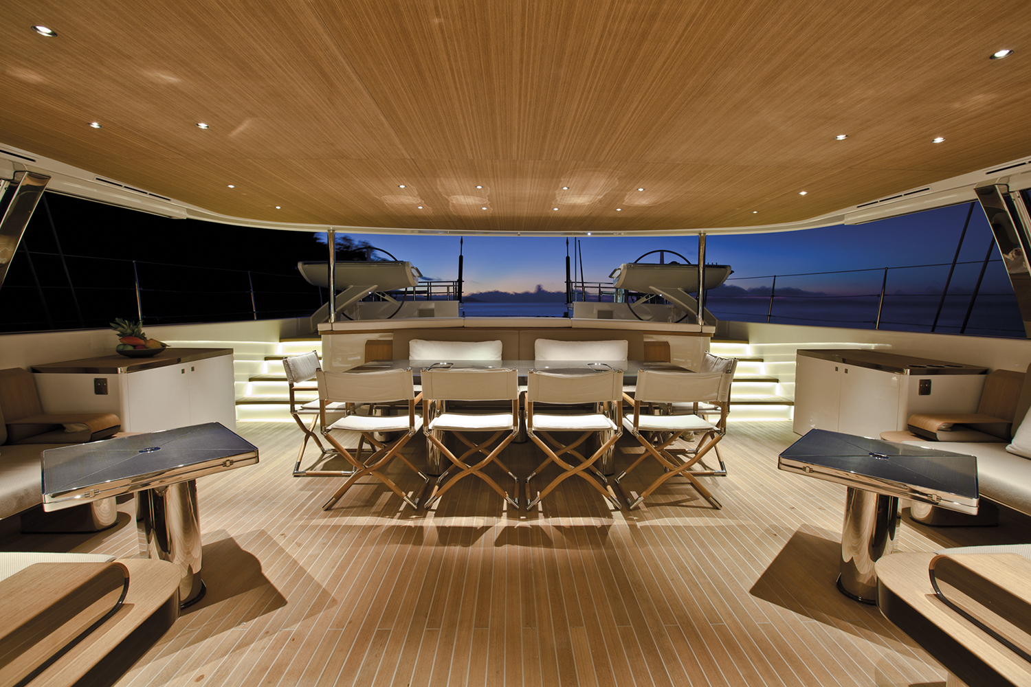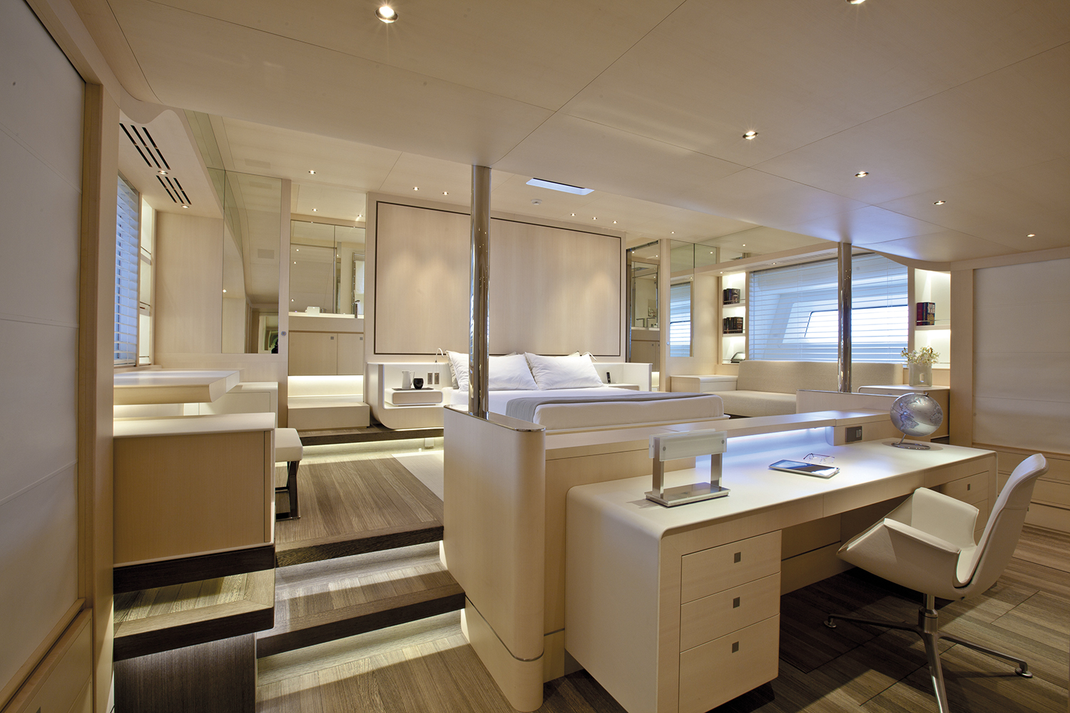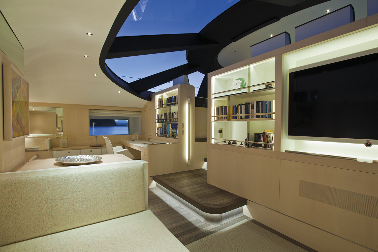 Gauged chromatic variety meets the discerning eye as it takes in lighter and darker shades of handcrafted woodwork placed without ever causing excessive contrast, followed by polished steel elements and ad hoc lighting which enhances relaxation throughout every area. The space chosen to house each piece of furniture, is fruit of careful study that has contributed into ensuring an uncompromised degree of comfort in the owners’ suite which is situated in the stern and in each of the three guest cabins as well.