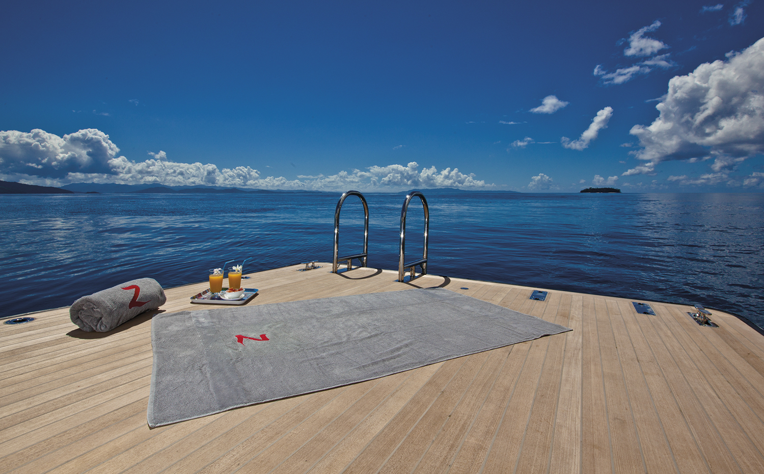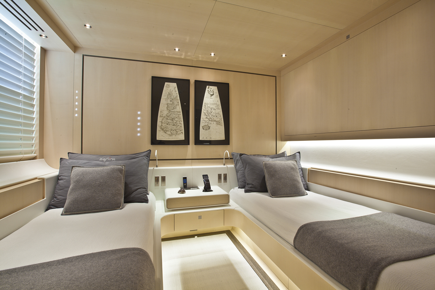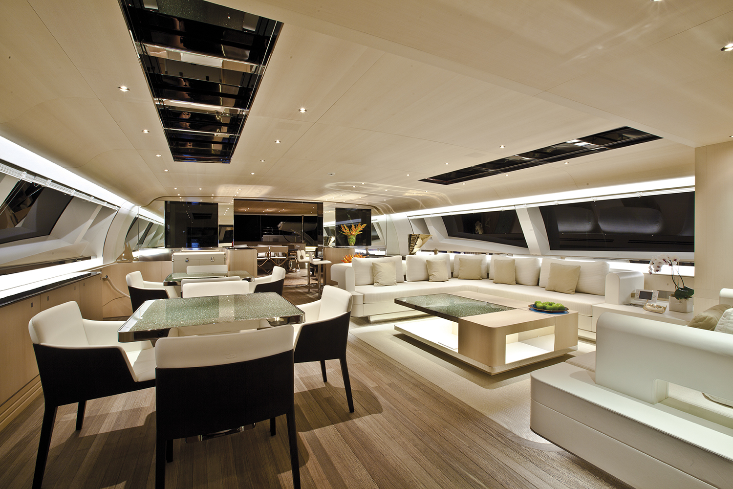 Gauged chromatic variety meets the discerning eye as it takes in lighter and darker shades of handcrafted woodwork placed without ever causing excessive contrast, followed by polished steel elements and ad hoc lighting which enhances relaxation throughout every area. The space chosen to house each piece of furniture, is fruit of careful study that has contributed into ensuring an uncompromised degree of comfort in the owners’ suite which is situated in the stern and in each of the three guest cabins as well.