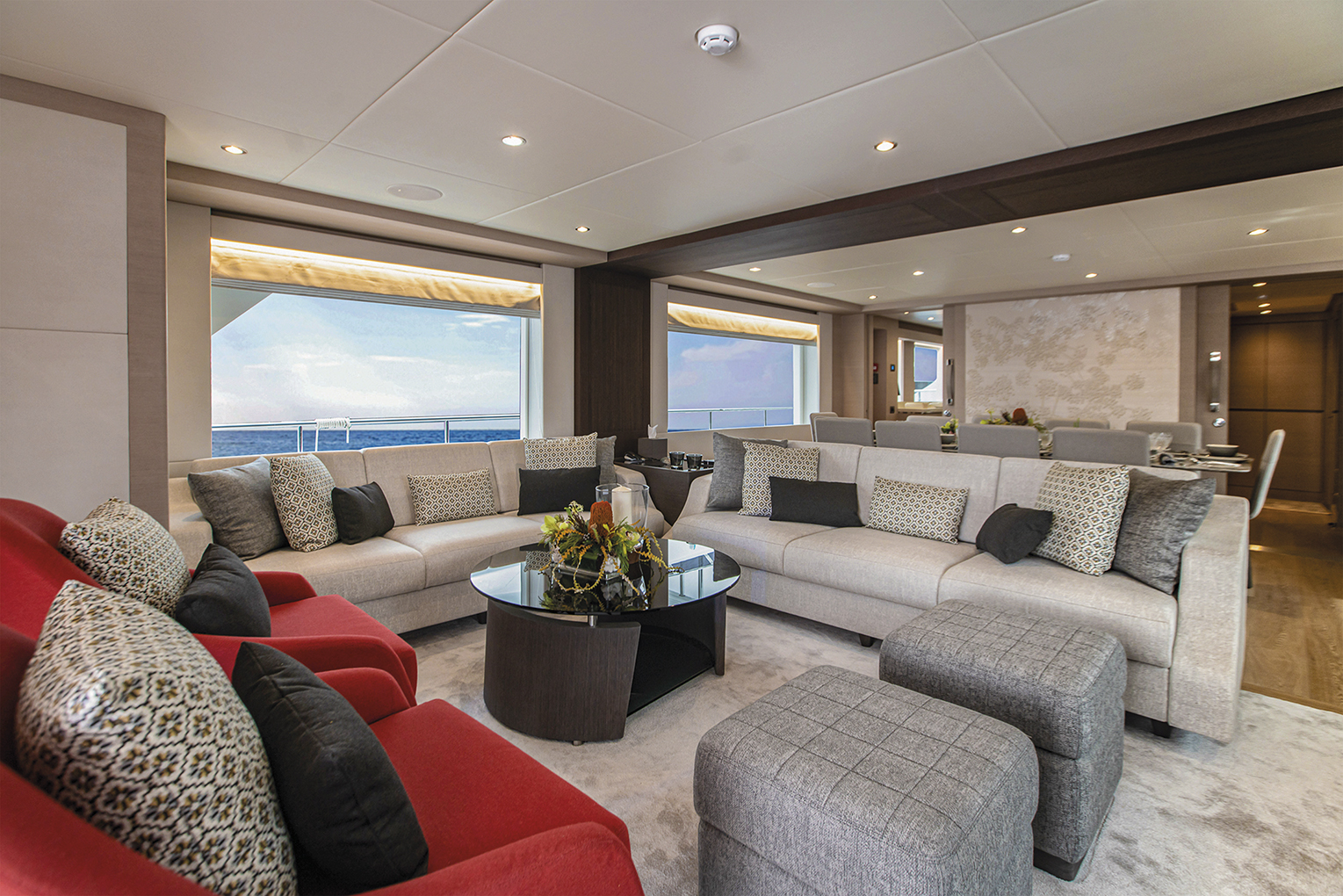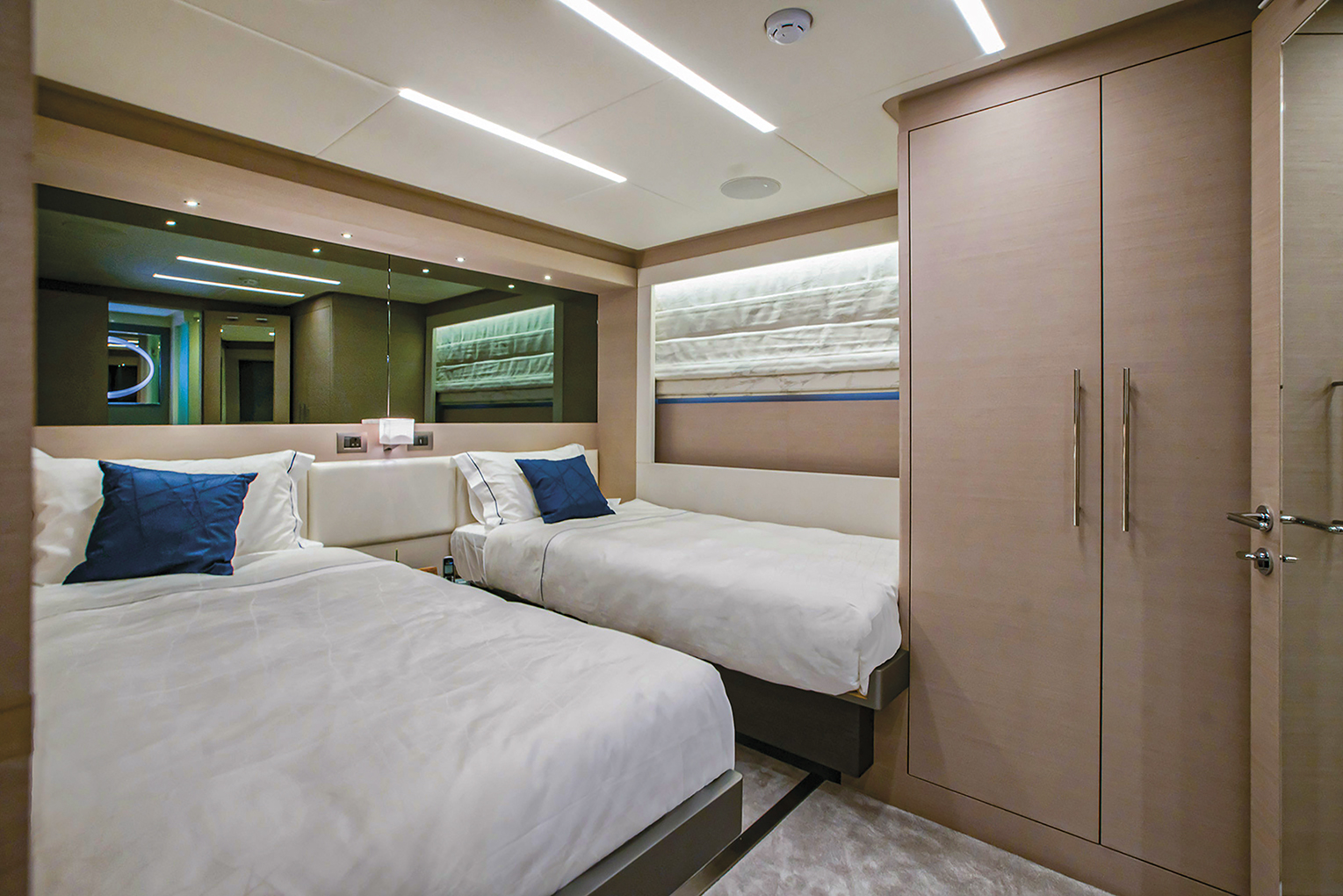 The living area is bright with natural light pouring through large window like ports along the top deck. It is furnished with a pair of sofas, two armchairs and a coffee table forward of which there’s a dining area seating up to ten. The galley is equipped with professional gear and looks the part as if to confirm the yacht’s long range capacity. After all there’s a technical fully equipped laundry area installed on board which comprises two tumble dryers as well and ironing boards. The decor can be accordingly semi custom but this vessel privileges contrasting colours such as yellow hues from sandy coloured oak essences and sober grey ones offering chromatic elegance.