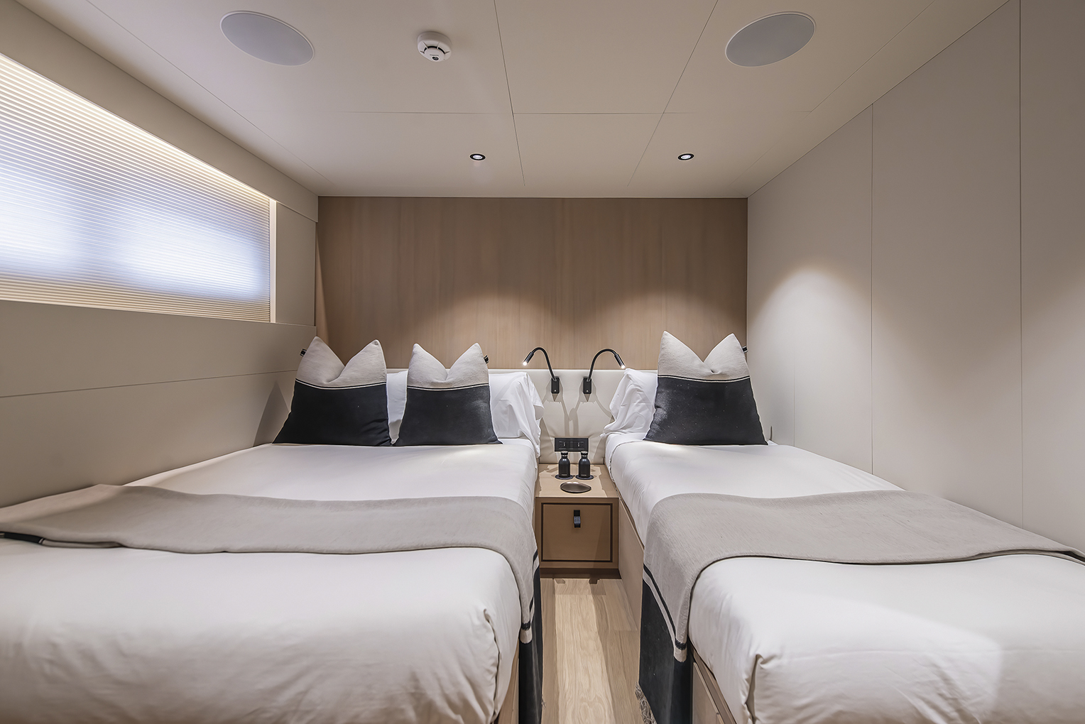 This also involves natural light flooding the boat, for a wonderful atmosphere onboard”. The ship’s initial layout included four cabins: the owner’s suite, one Vip and two doubles, with crew accommodation behind the engine room. The owner, however, chose a different one: he limited guests’ cabins to three and integrated crew cabins within the guests’ area. Crossover 27’s internal layout now provides a large owner’s suite, two large guests’ cabins and as many for the four crew members.