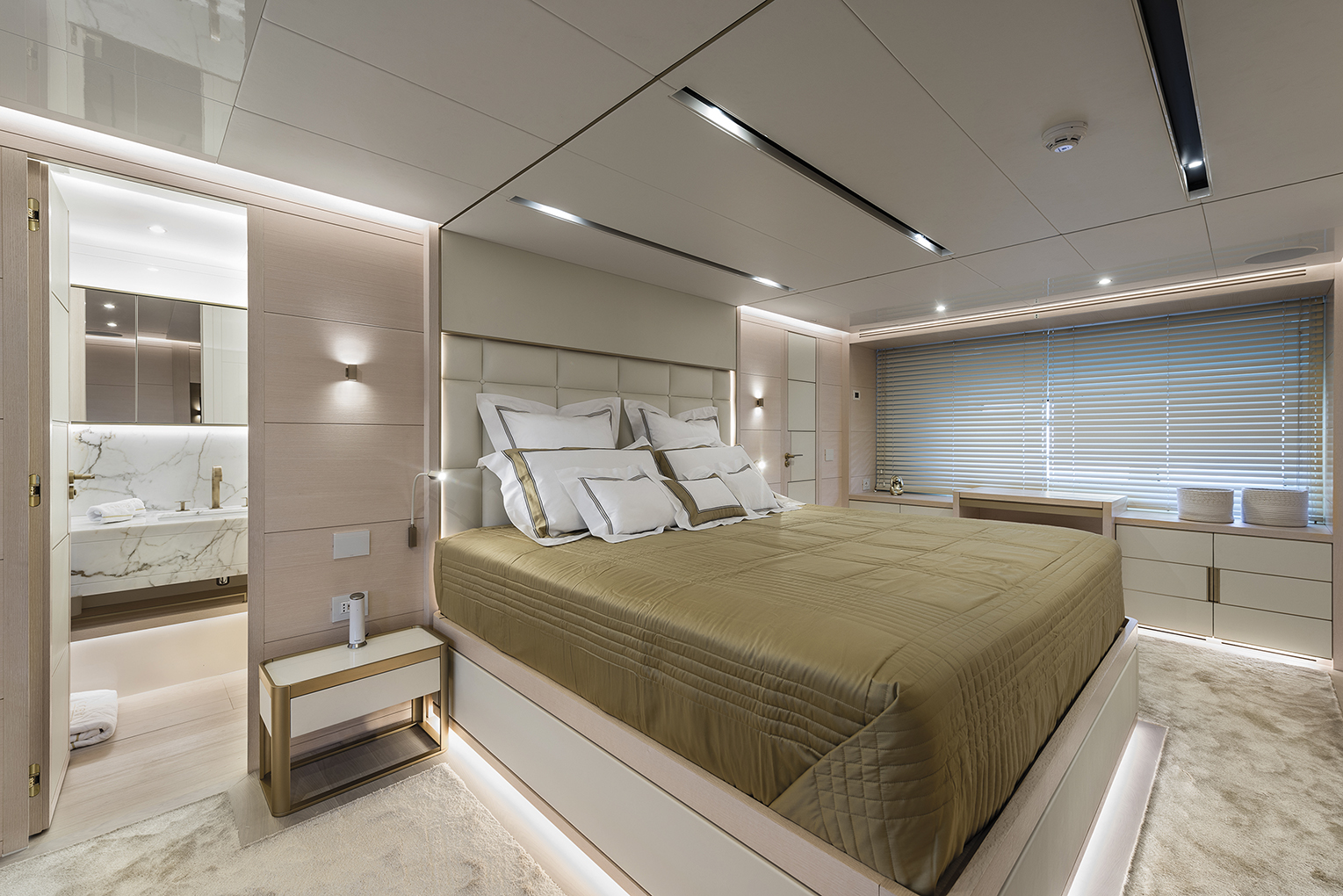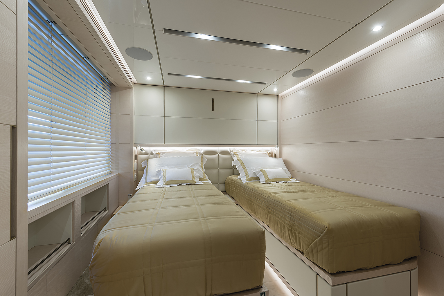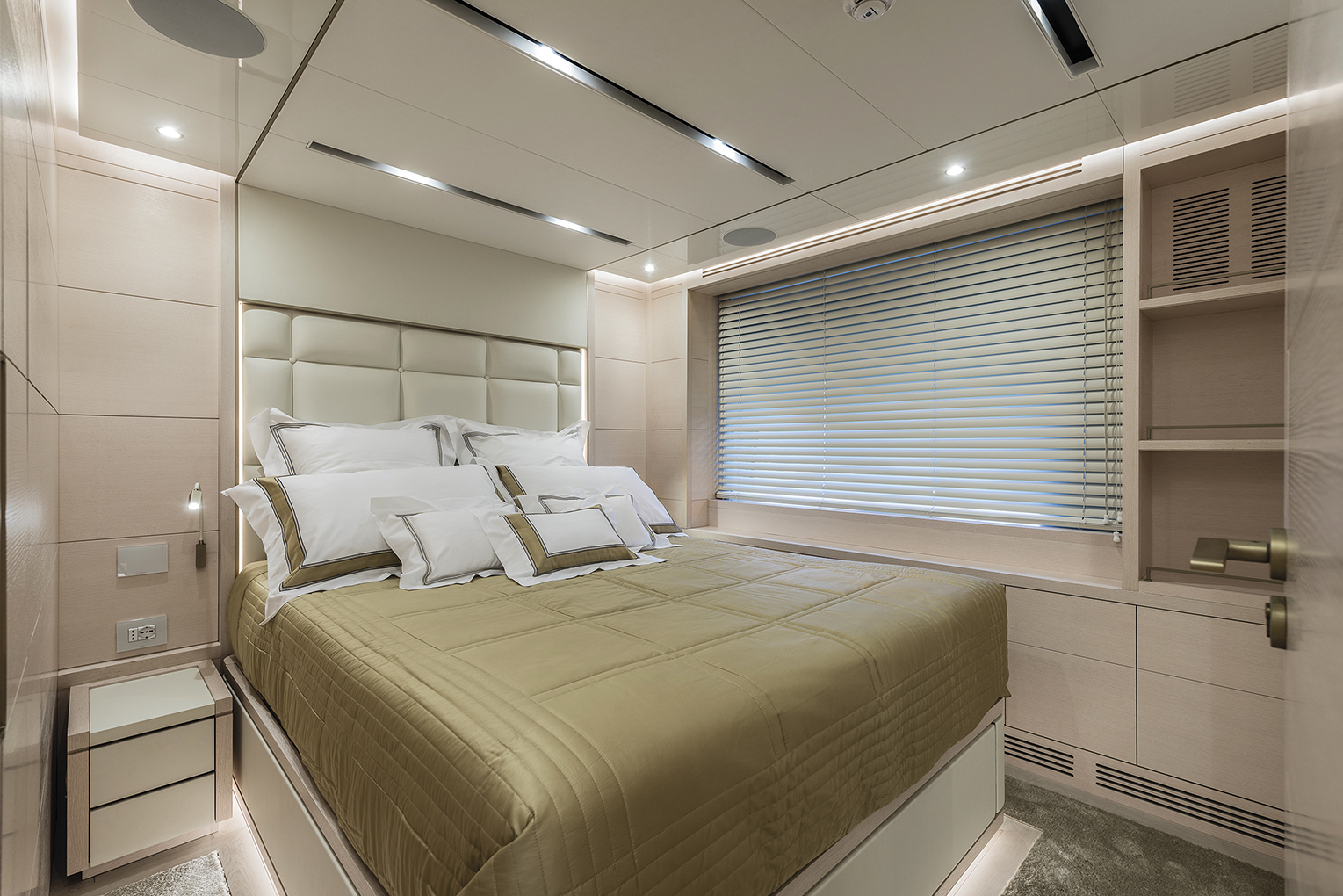 The layout comprises a bright living area with floor to ceiling window like ports, a lounge area furnished with sofas, chaise longue, low table and a dining area with a seating capacity of ten. Proceeding forward toward the bow section there’s a fully equipped professional galley which can be accessed directly from the deck, a large store room for food and drink, an ice maker and wine cellar. In order to facilitate the crew’s work and so as not to interfere with the owner and his guests, the crew’s quarters with dinette, laundry, two doubles and a single cabin for a total of five crew are accessed from this point. Access to the helm controls station from the pantry between the galley and entrance to the lounge to further guarantee guests’ privacy.