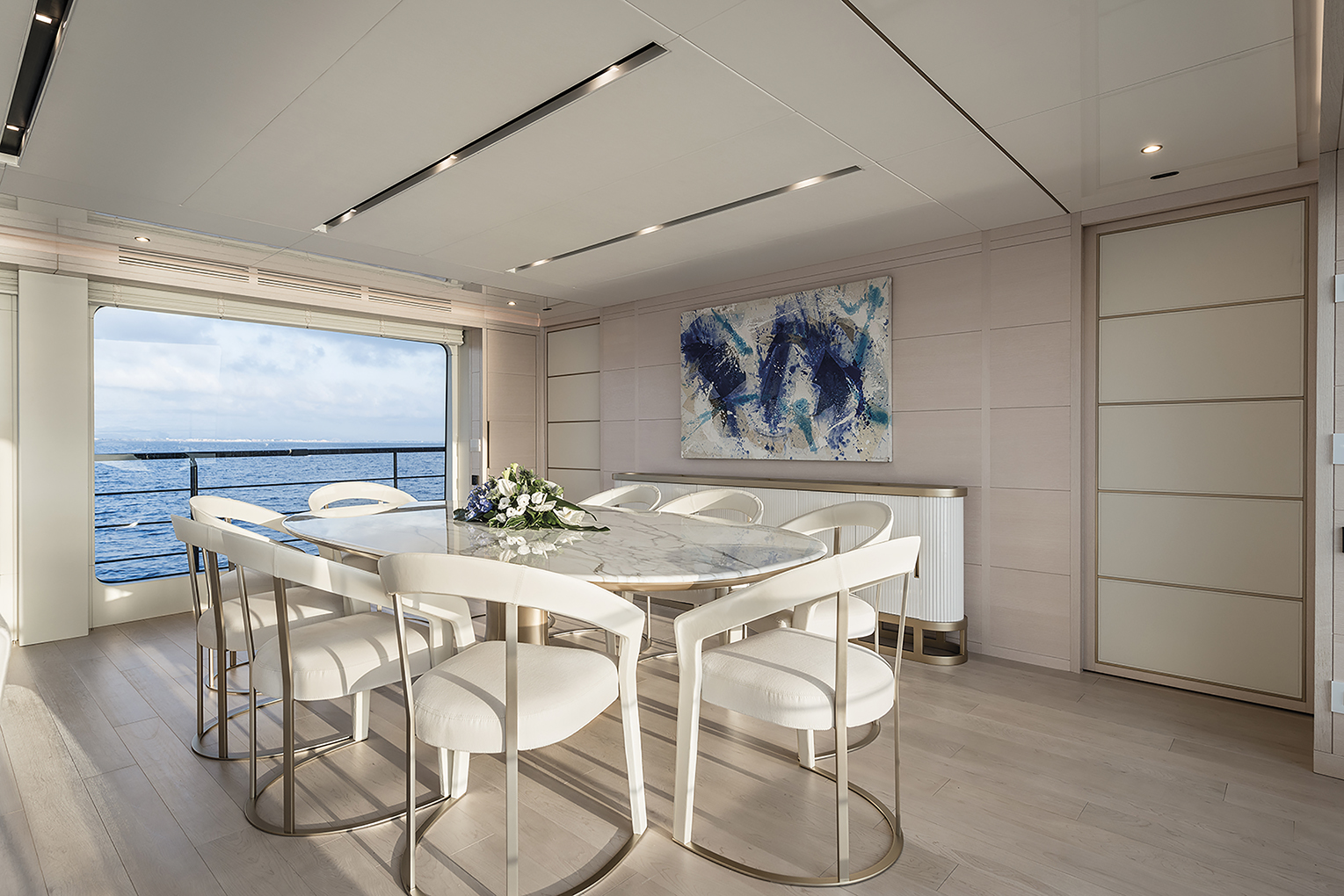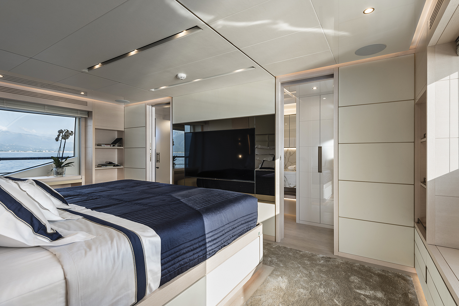 Fossati Architects’ studio exploited the available volumes remarkably making full use of the 7.50 metre beam this yacht possesses together with a headroom of over 2.10 metres. This model is one of the most spacious in its category. In 2018 Fossati studio handled the interiors of a 40 metre explorer for Maiora, and fulfilled the owner’s wishes by interpreting impeccably his every wish providing a precious and bright decor highlighted with brushed whitened oak furniture matching with white leather lined doors and ceilings with harmonizing bronze inlays.