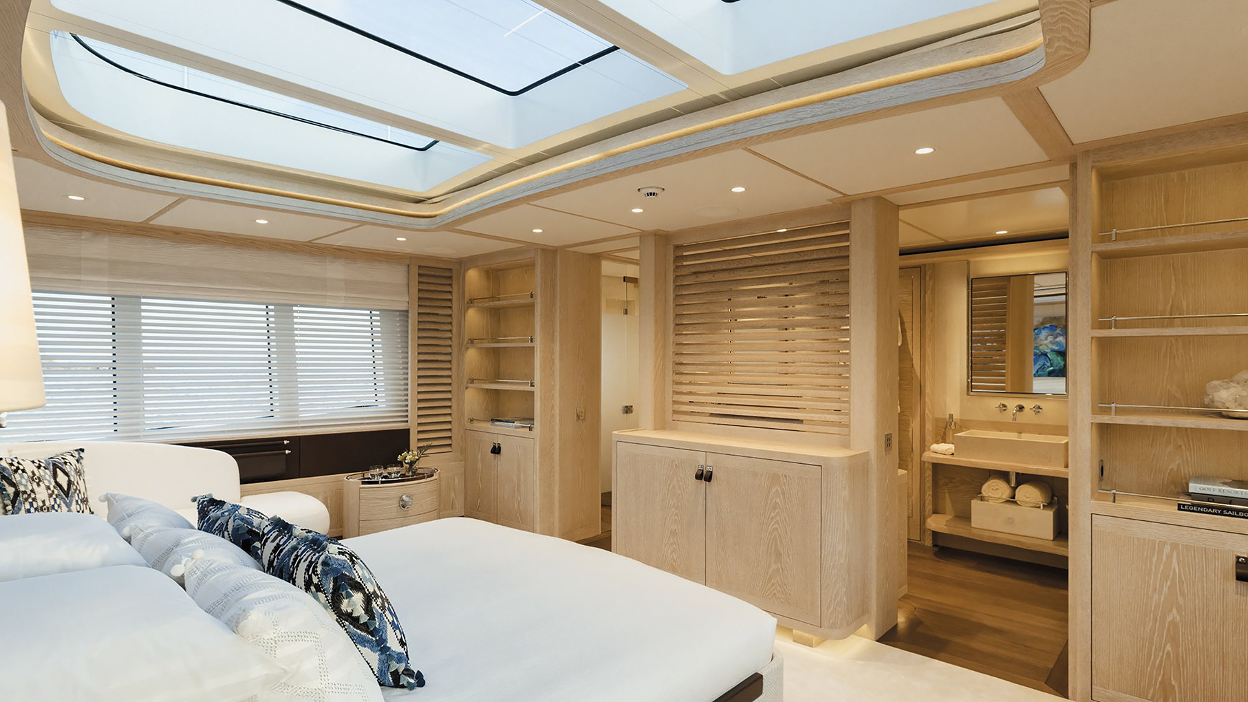 The modern design was initialled by Claydon Reeves studio which wanted to emphasize continuity between the interior and exterior spaces by deploying plenty of glass. Large floor to ceiling glazed panels almost extend over the entire perimeter of the main deck which allow plenty of light to penetrate the interiors while maintaining visual contact with the surroundings. All of this is guaranteed also thanks to opening topsides in line with the dining area.