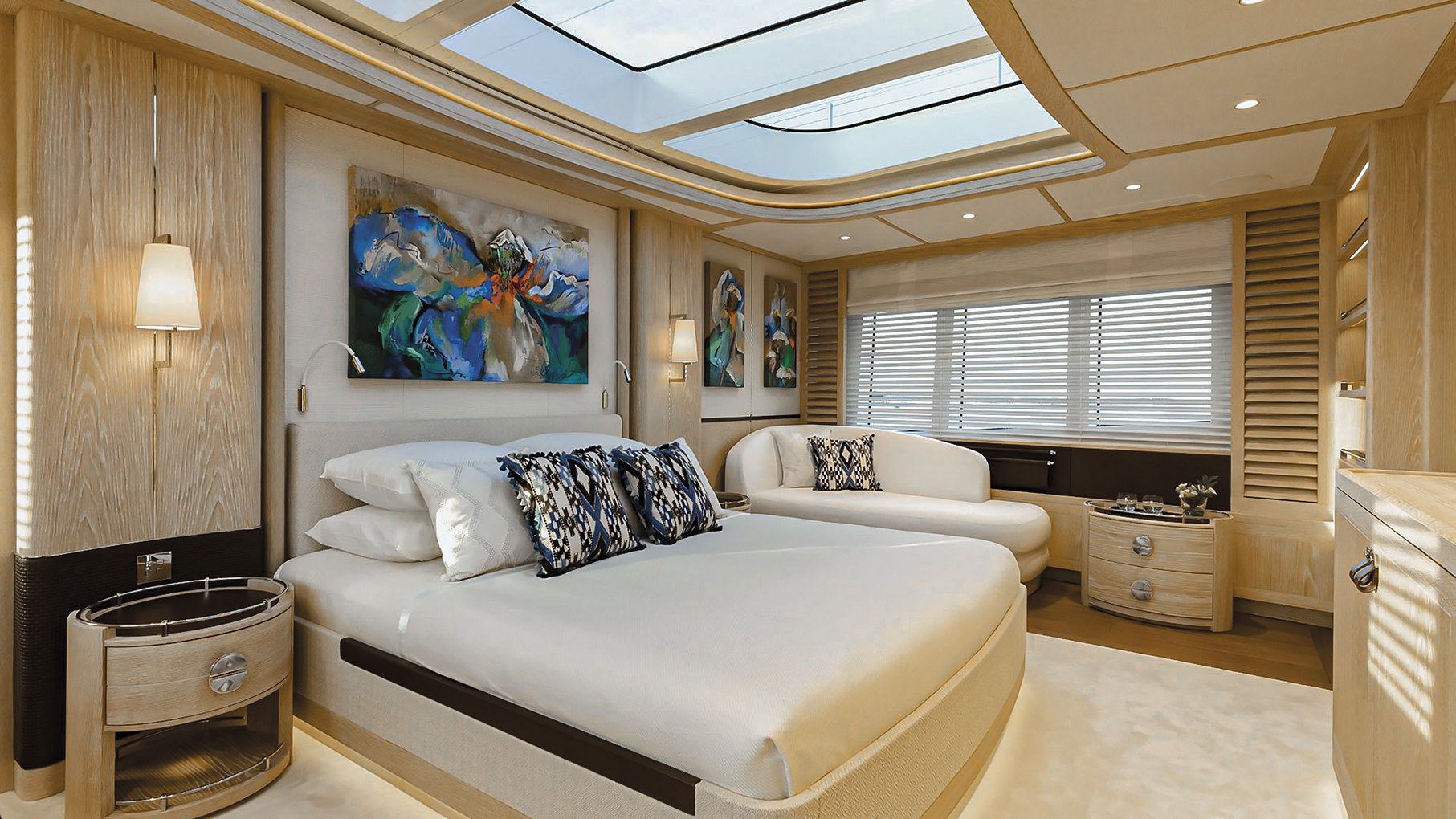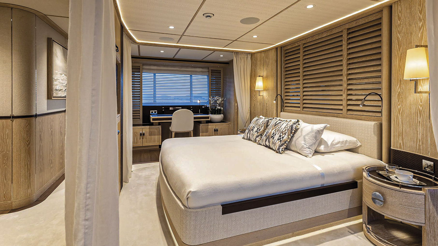 On board Calypso, bright interiors stand out and they’re enhanced by light pale fine fabric and essences by Vickers Studio. The decor is elegant and refined with finishes expressing a conventional atmosphere of good taste.