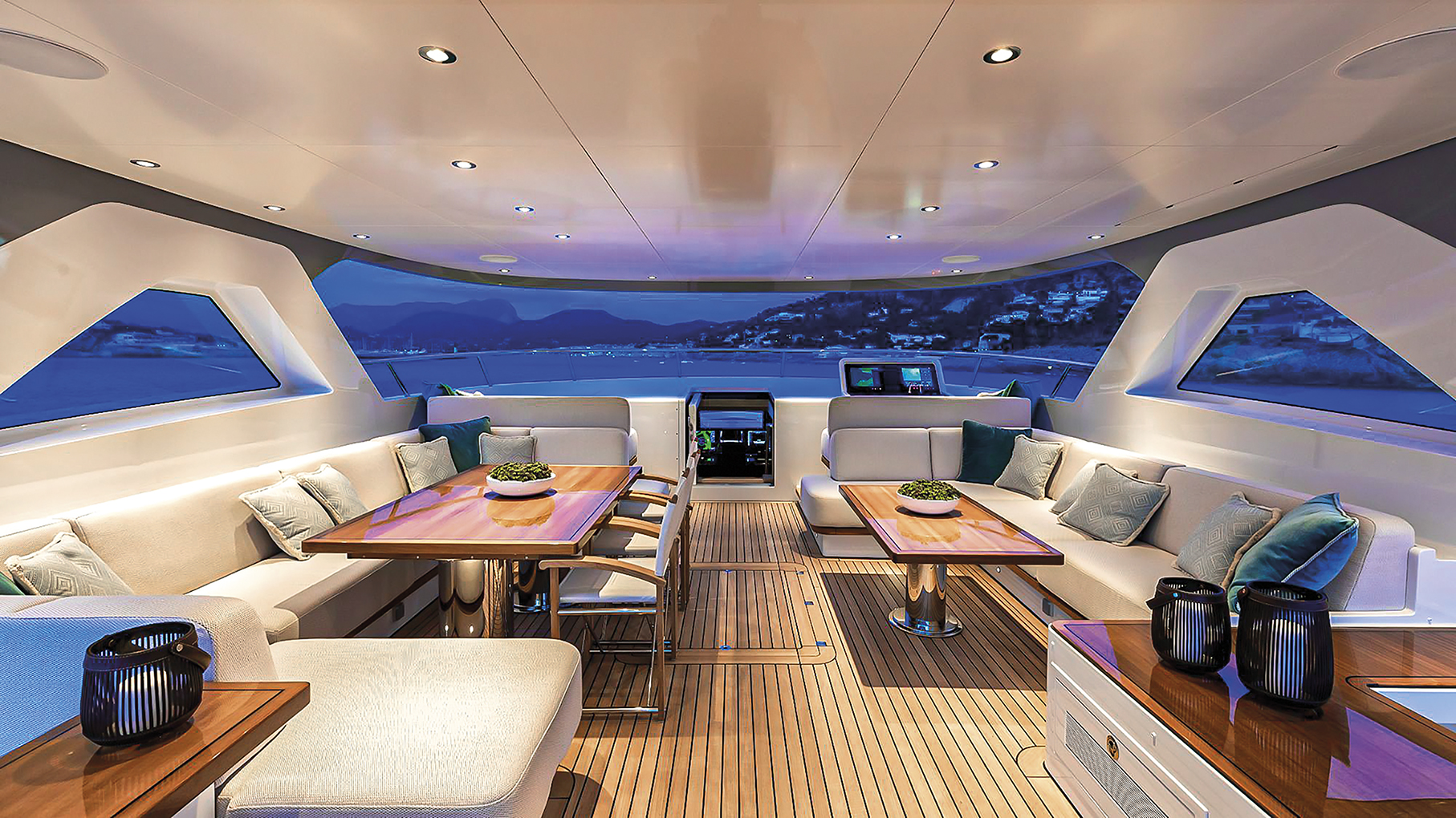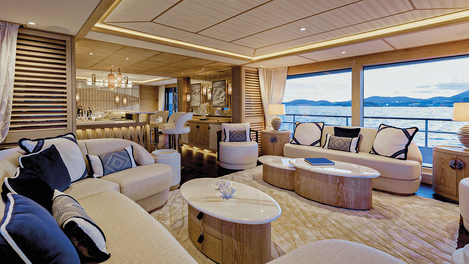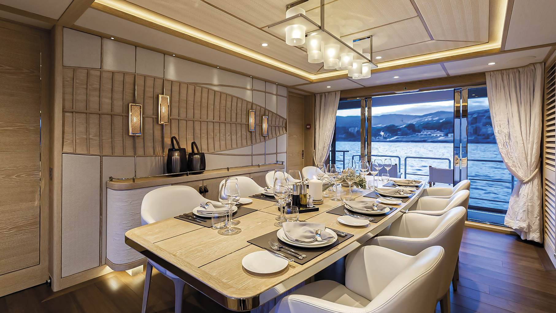The main saloon features soft sofas and low standing furniture so as to interfere as little as possible with the floor to ceiling glazed panels. A well appointed bar separates this area from the dining one which is aligned with sliding glass doors and outward opening topsides.