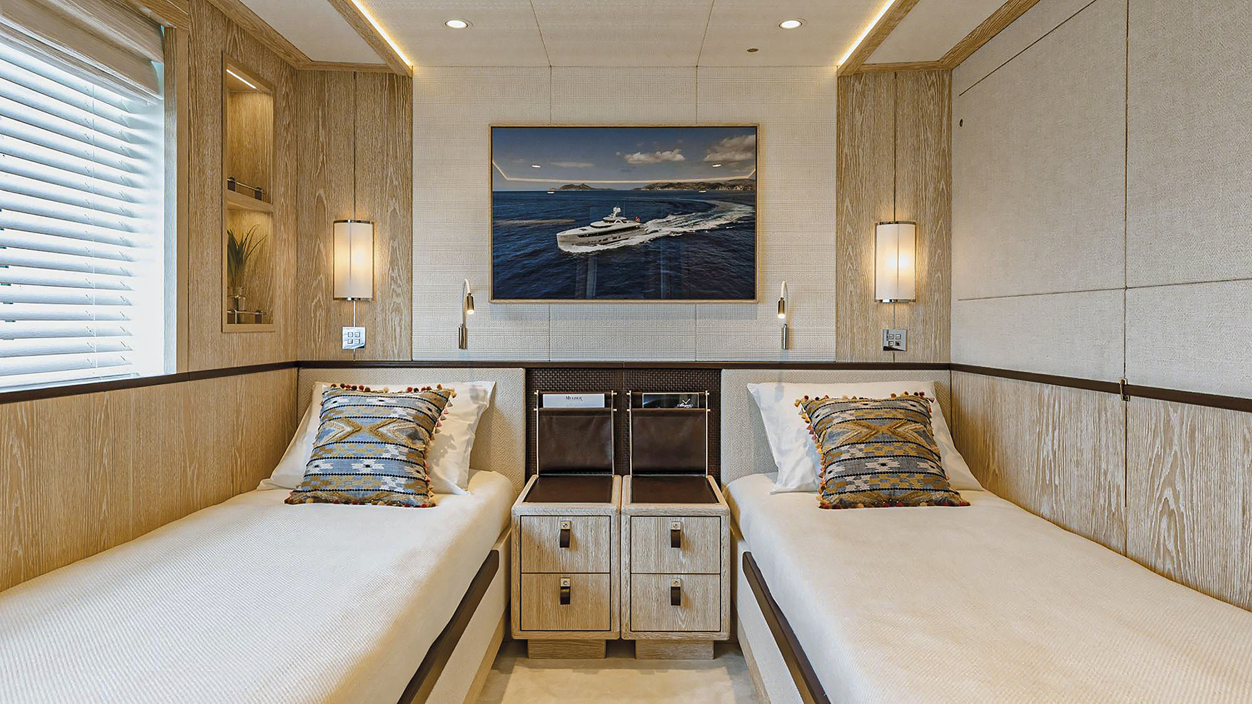 The owner’s suite takes up the wide body section of this deck and also includes a private study, a small corner lounge in which to relax, a large bathroom sporting marble tops as well as a private external terrace. Below this deck there are three guest cabins of which one is a VIP while the other two are equipped with twin beds.