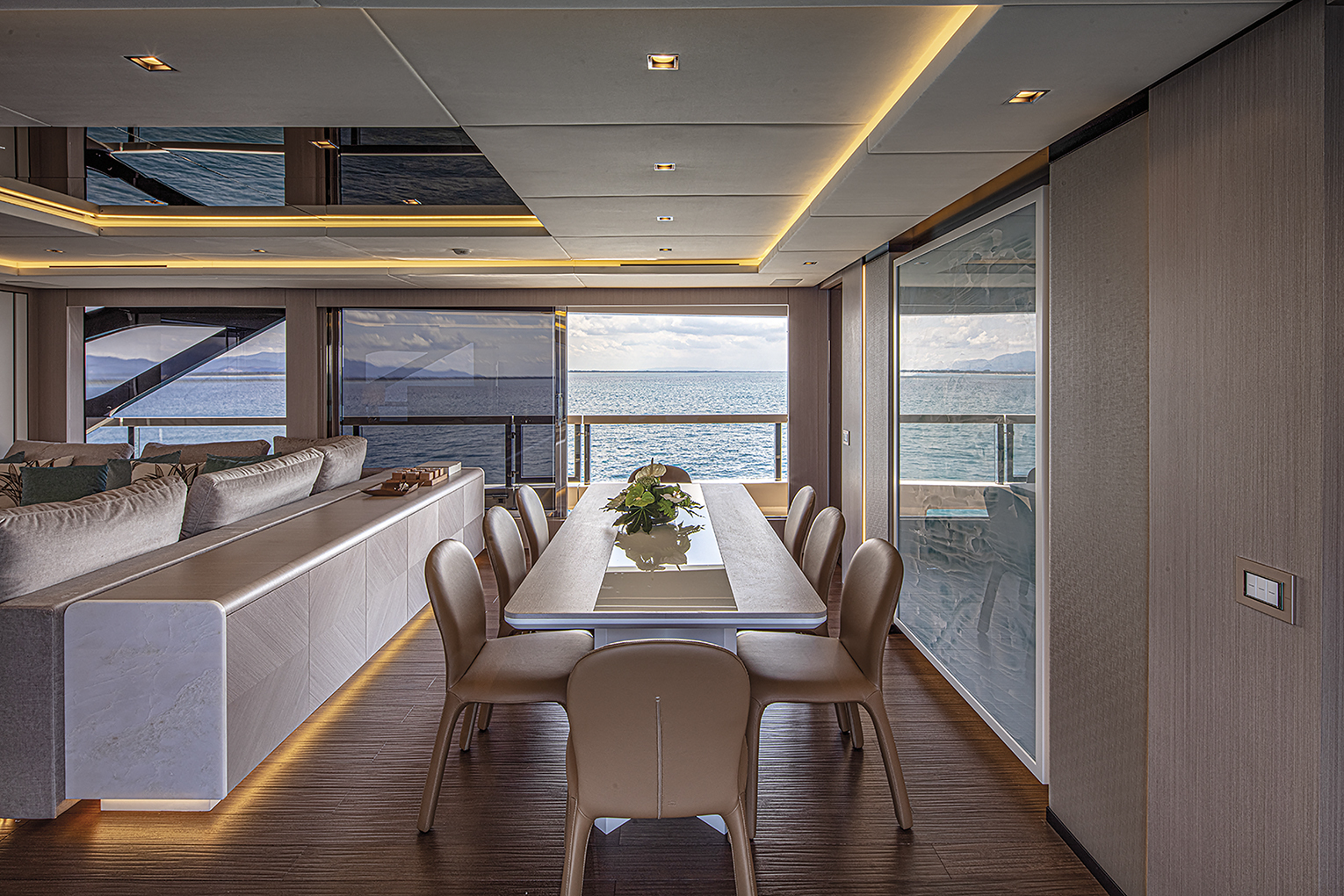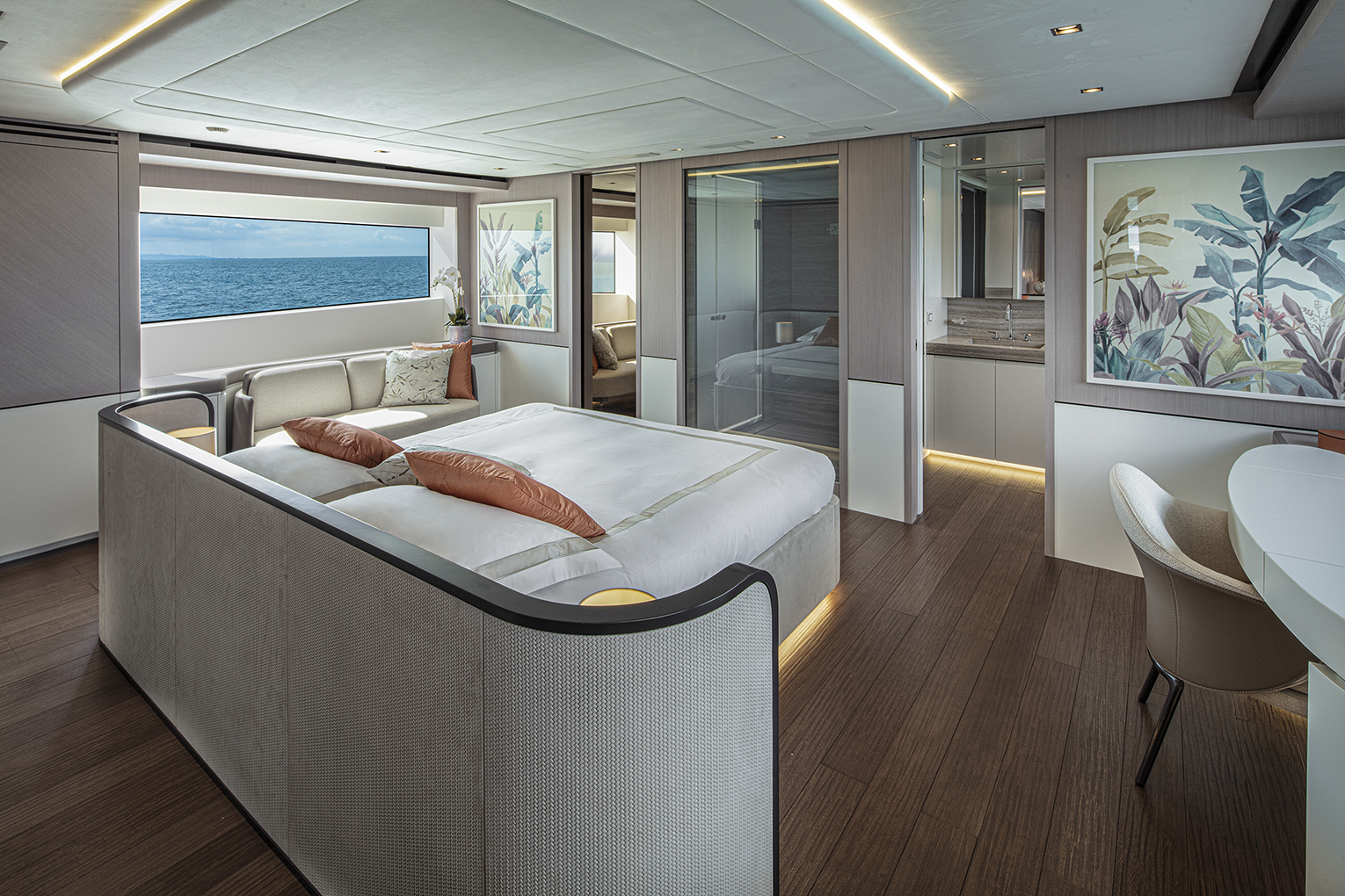 Below the cockpit there’s a 28 square metre garage with room enough for a 5.65 metre long tender and two jet ski. As for performance according to the yard a top speed of 25 knots is doable while a recommended cruising speed of 21 knots should deliver a range of approximately 330 nautical miles with four Volvo Penta D13 1000 IB engines linked to as many Volvo Penta Ips Pods. Given the high degree of technology employed, with the power system which reportedly optimises fuel consumption while enhancing comfort thanks to low vibration and reduced decibels throughout the speed range.