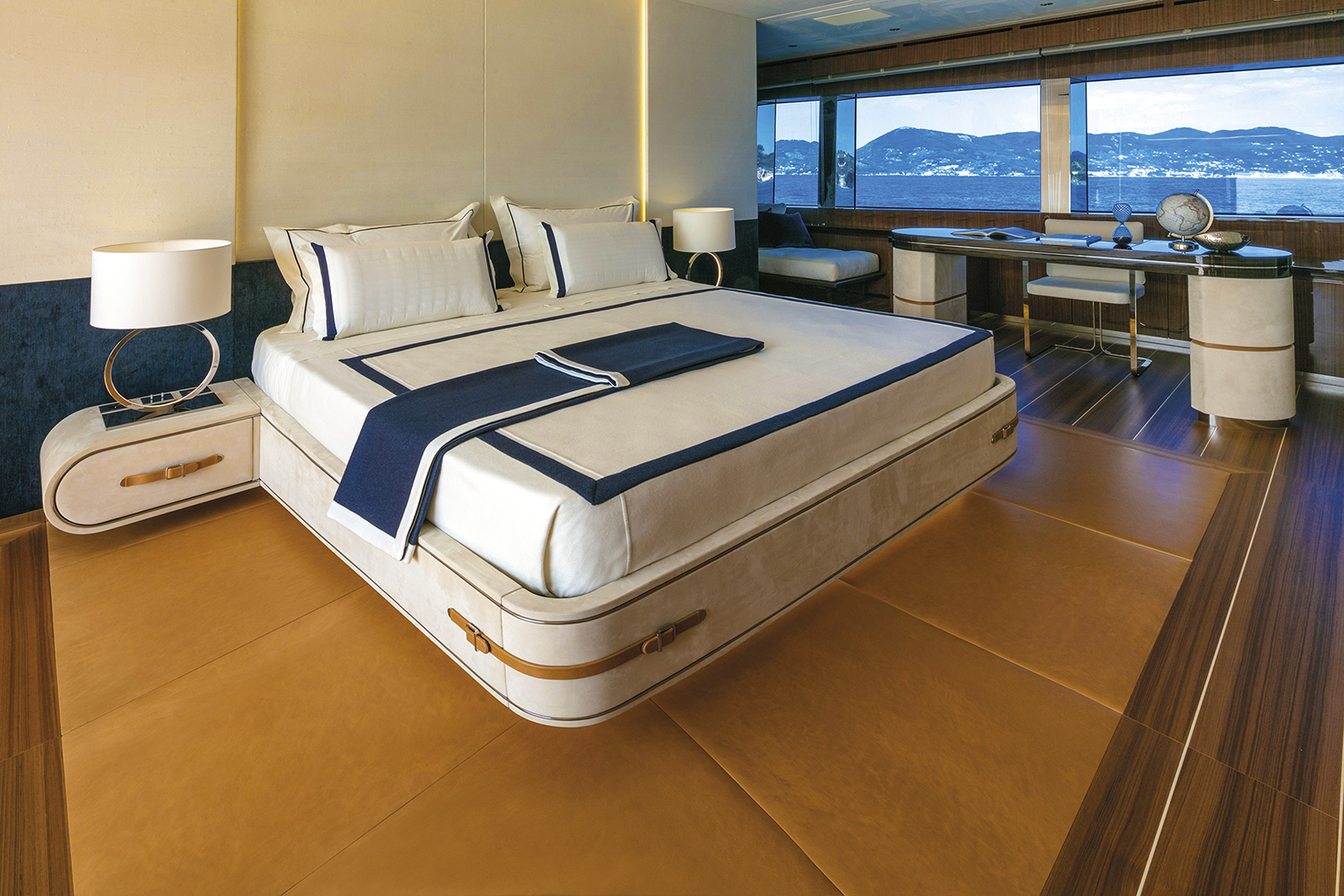 Alberto Mancini’s winning design brings out El Leon’s sporty performance thanks to a flowing sleek silhouette despite decidedly considerable interior volumes where headroom is never less than 2.10 metres. The interior layout and decor by Alberto Mancini and Overmarine’s Design Department was developed according to the owner’s wishes based on the use he intends to make of this yacht, which entails cruising Mediterranean waters and deploying it as an explorer on which to spend much time. In fact the owner’s suite has been situated in the bow area of the main deck and comprises a private study, while a well equipped gym and a media/entertainment room flank the guest cabins made up of two VIP cabins and two twins below deck revealing El Leon’s desire to cross oceans.