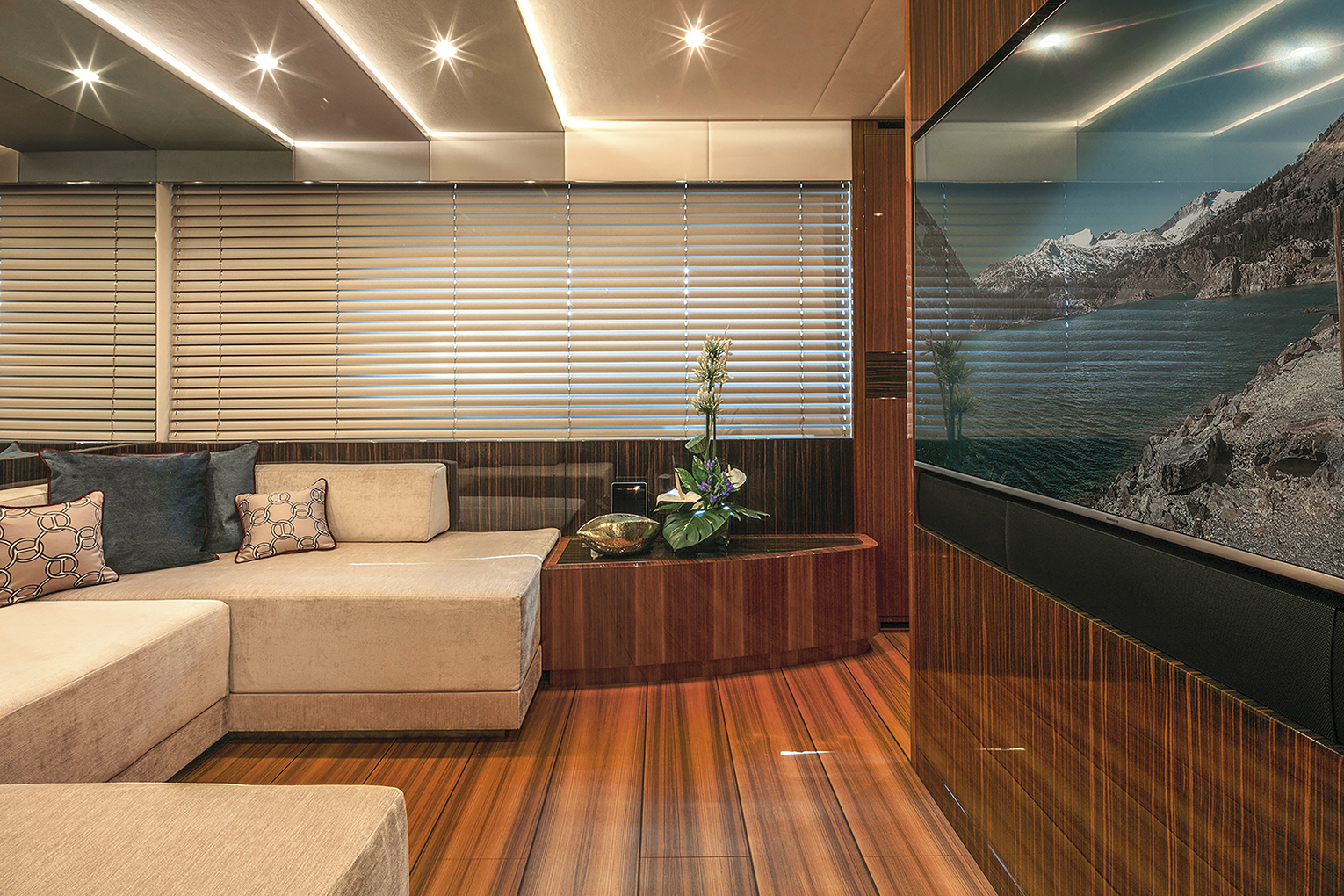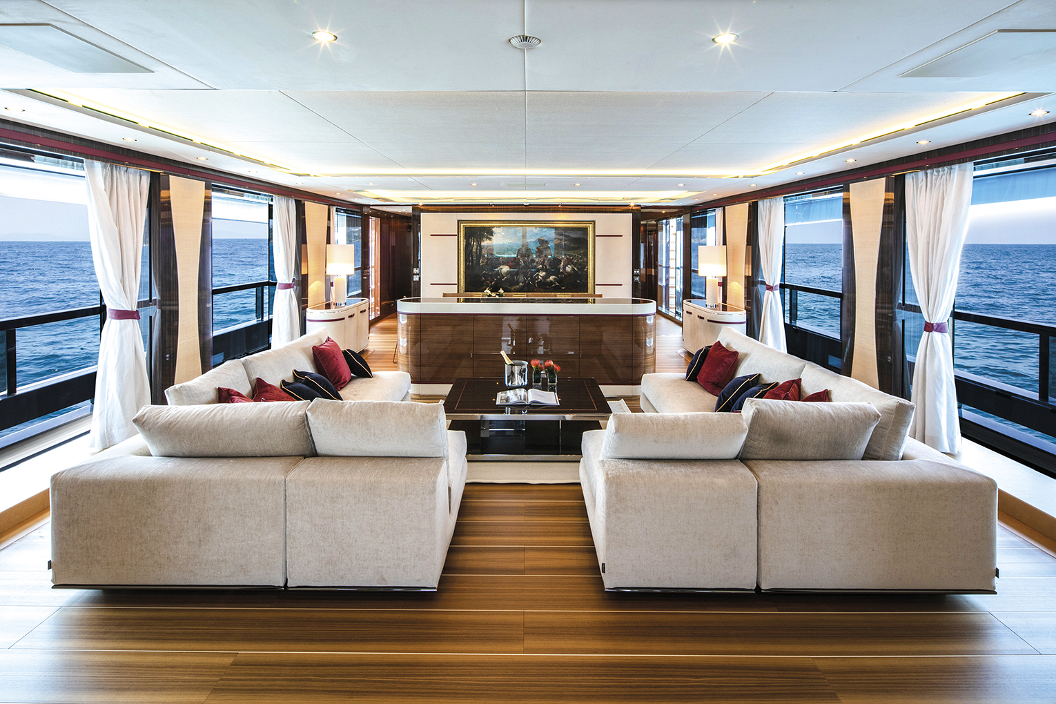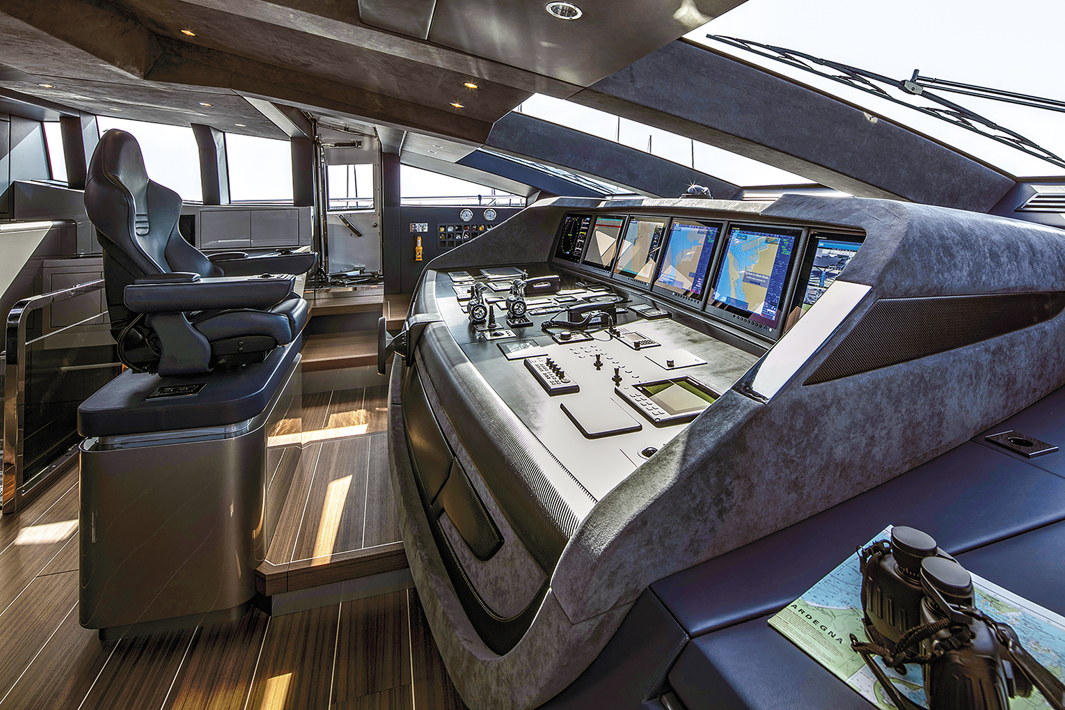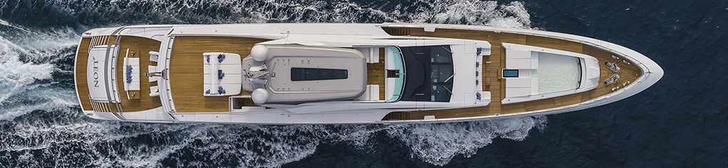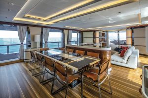 The details in the overall decor stand out creating a pleasant welcoming atmosphere thanks to the led lighting system to the tasteful quality of the materials used, the traditional teak flooring with white ash stripes, the skin decorating most of the ceiling panels while the furniture’s walnut and ebony essences complete the picture. Large cut glass window like ports brighten up the interiors while conveying a unique sense of continuity between the two realities, there are 273 square metres of open air space for outdoor activities and of which more than 100 are up on the flybridge. Here we come to a raised dining area, protected by lateral cut glass panelling and by an integrated hardtop above sporting a cut glass central portion delivering natural light.