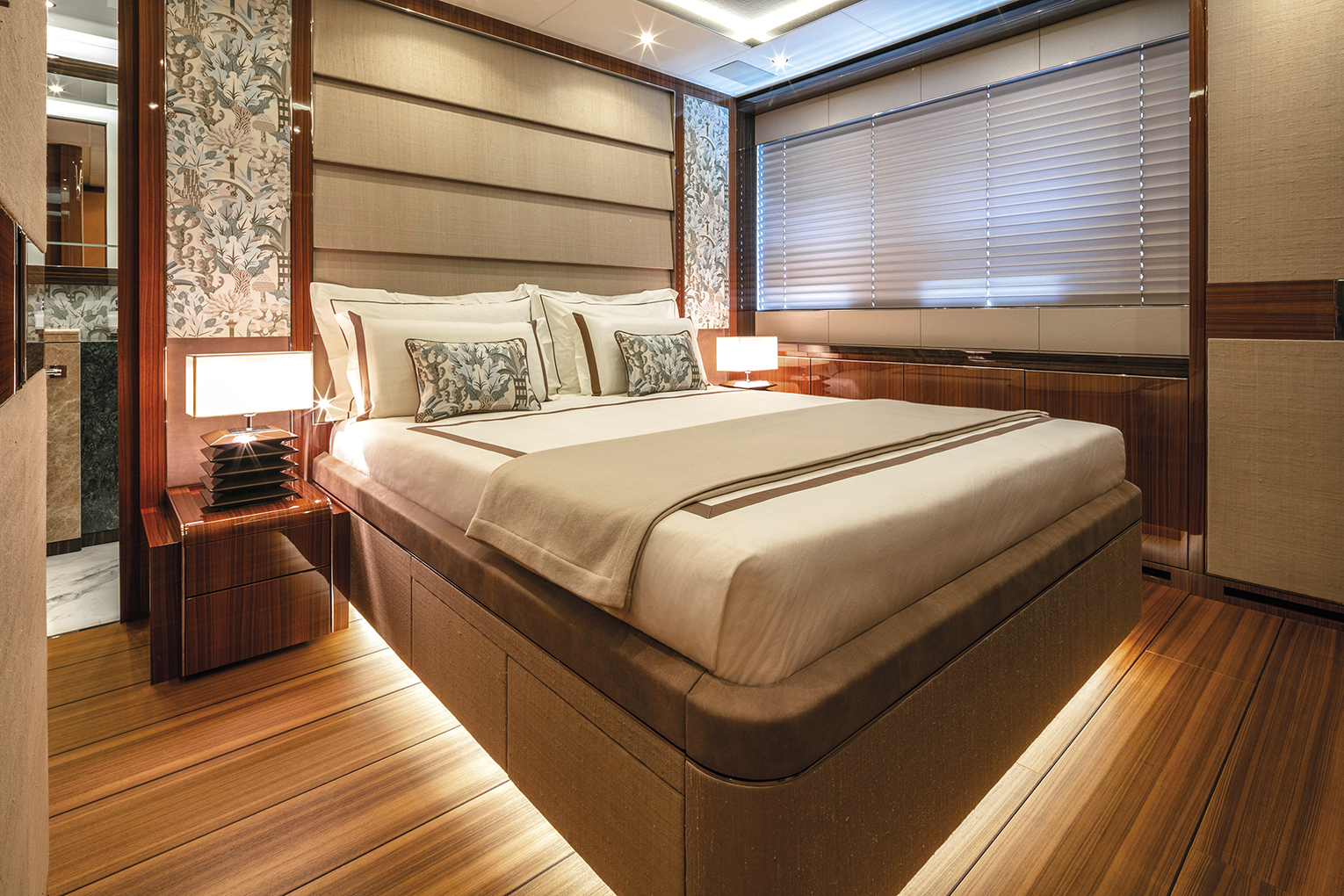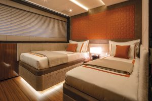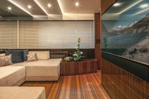The distribution of some of the exterior spaces offers guests several different choices and solutions, dining area, lounge area, or simply to relax by the infinity pool or enjoy a hydro-massage inside it. The bottom of the pool is transparent and allows plenty of light to filter through it onto the owner’s bathroom situated below it. When open, the stern transom and the two lateral parts all together form a lovely well equipped beach club with a surface area exceeding 70 square metres.