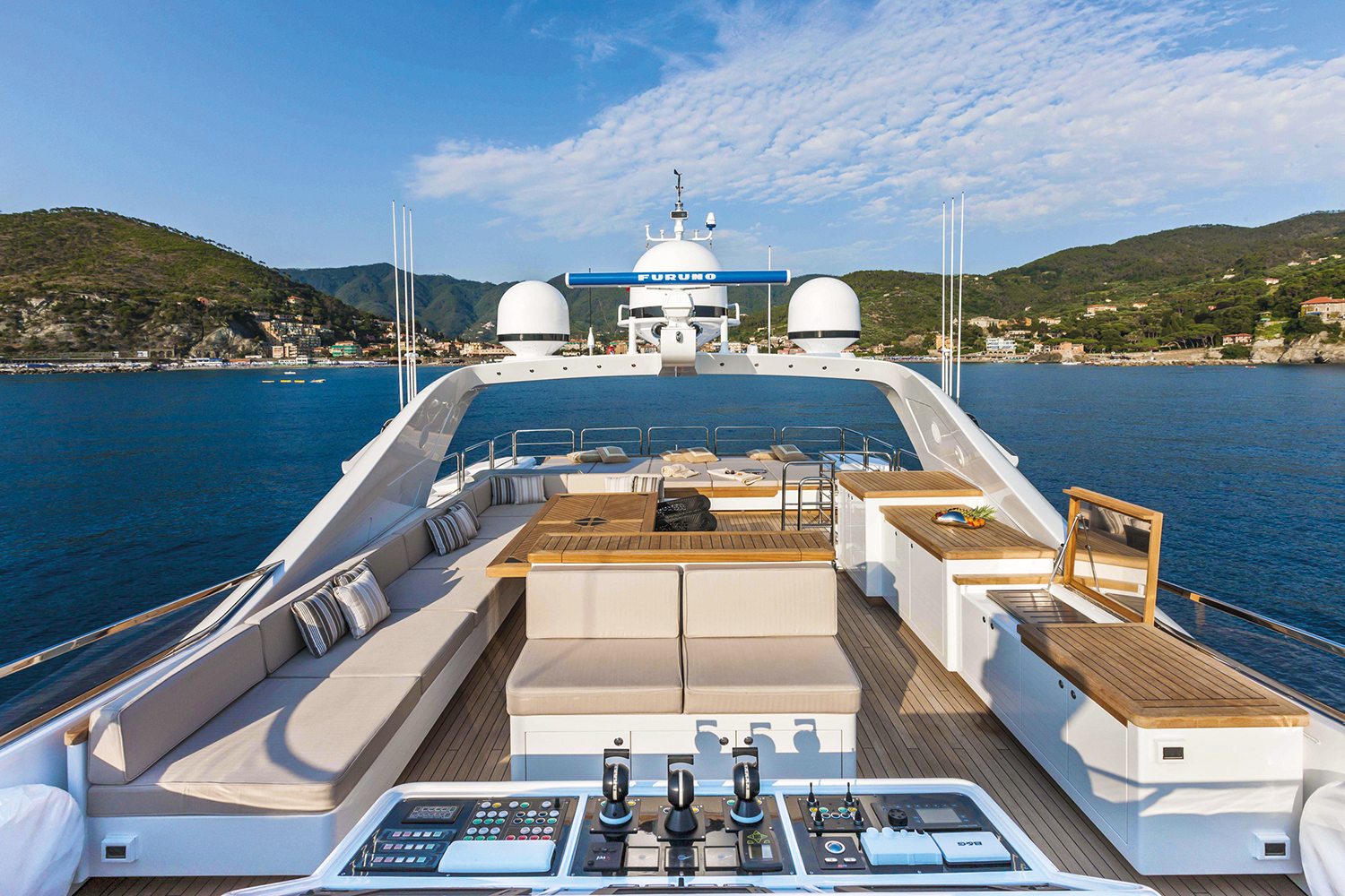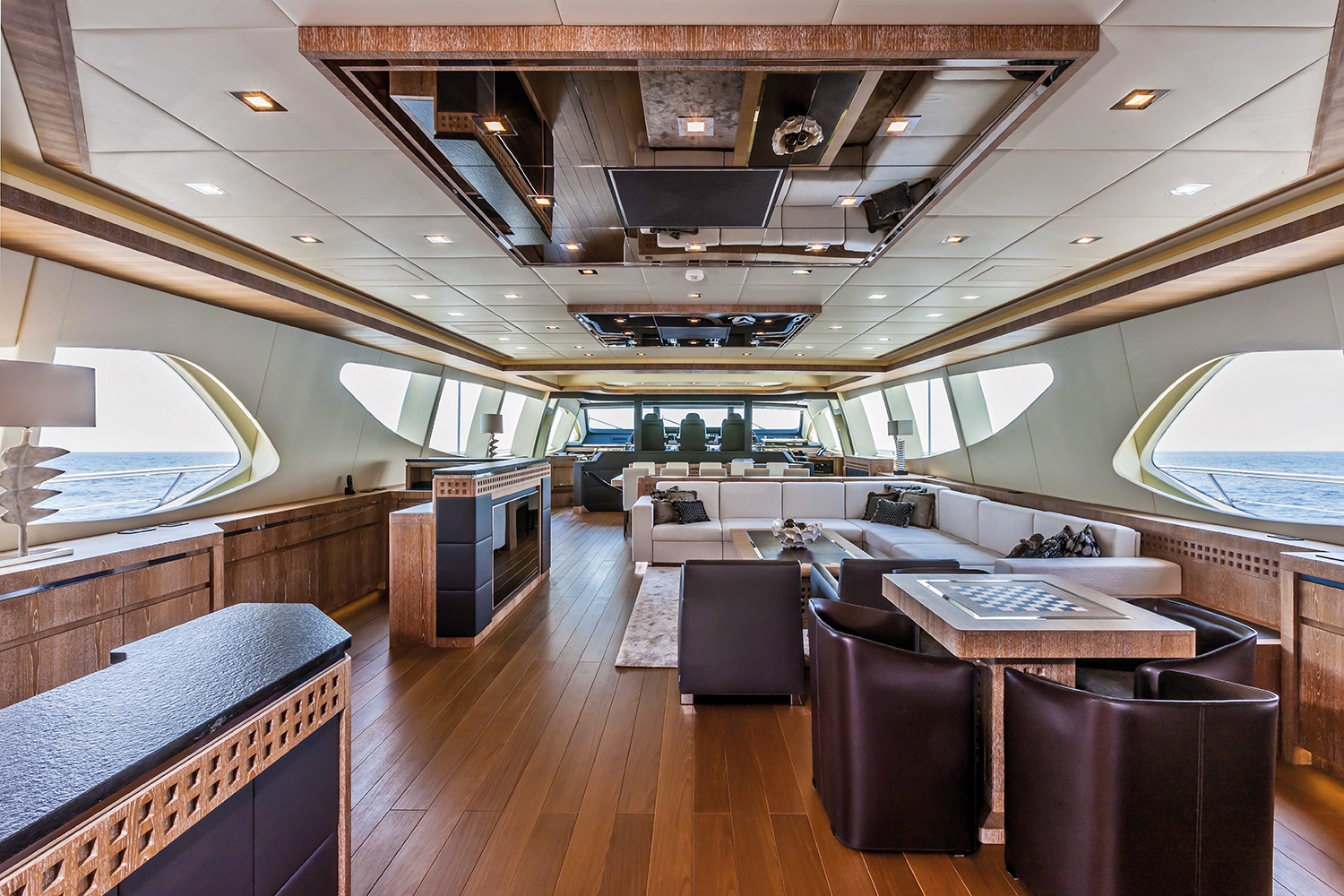 To be entirely honest the 165’ we saw in Florida can leave one gaping in complete astonishment even those who’re used to seeing large yachts and at a boat show like the one in Miami there are plenty of large ones. The sheer dimensions of this open meaning LOA and beam but also for its volumes where it is difficult to find the same headroom this Mangusta boasts in a bigger multi-decked steel ship, were we to talk about the living room – where at first glance entering from the stern the effect is simply determining since we are in fact talking of an open space boat with an opening roof top which extends from the limit of the cockpit to the wind screen with no bulkheads of any kind and comprises a large living room with sofa and chairs, a dining area seating ten, a wet bar, television set cabinet, helm/controls station with three seats for pilot and co-pilots – or were we to refer to the lower deck, where we find the guests’ quarters as well as the crew’s.