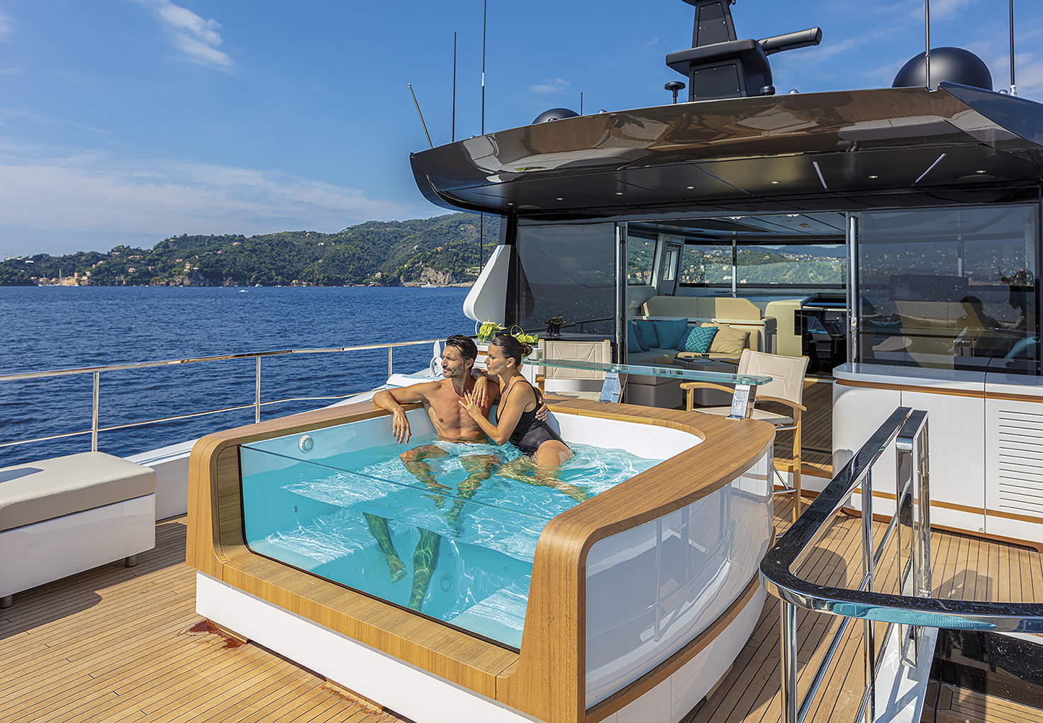 The former, bow-oriented, is a stunning pool called “The Island”, as it exactly looks like a sunbathing island, 360-degree surrounded by water, and accessed by a teak bridge for a complete integration with the surrounding environment. The pool is partially glass-bottomed , so as to allow natural light to reach the deck below.