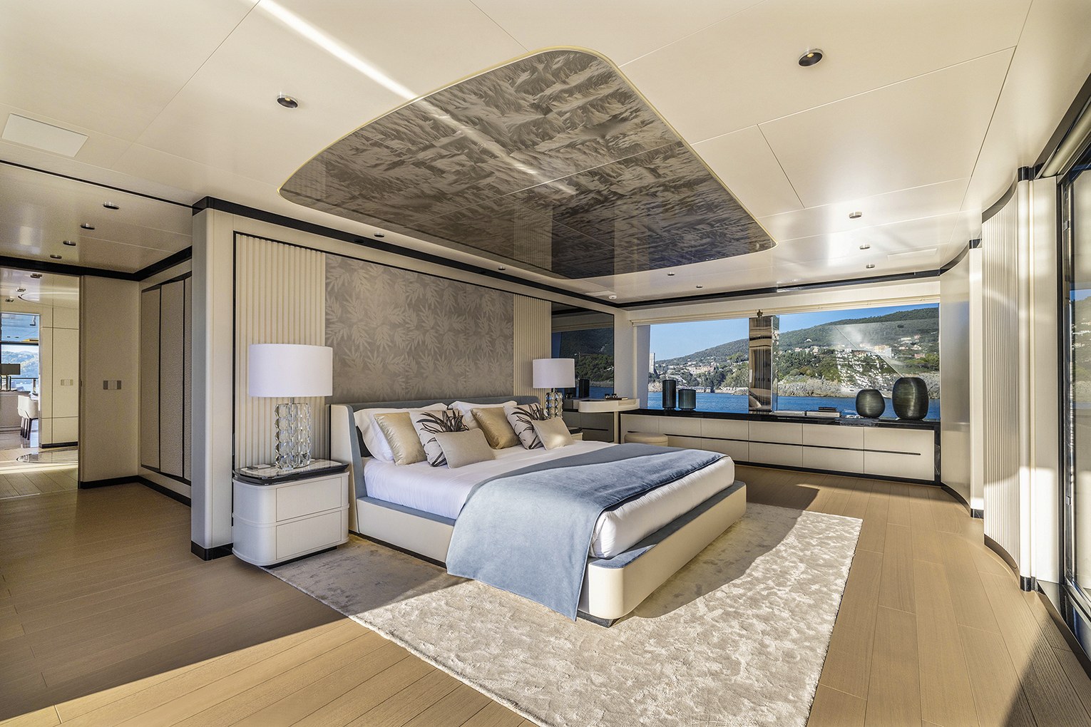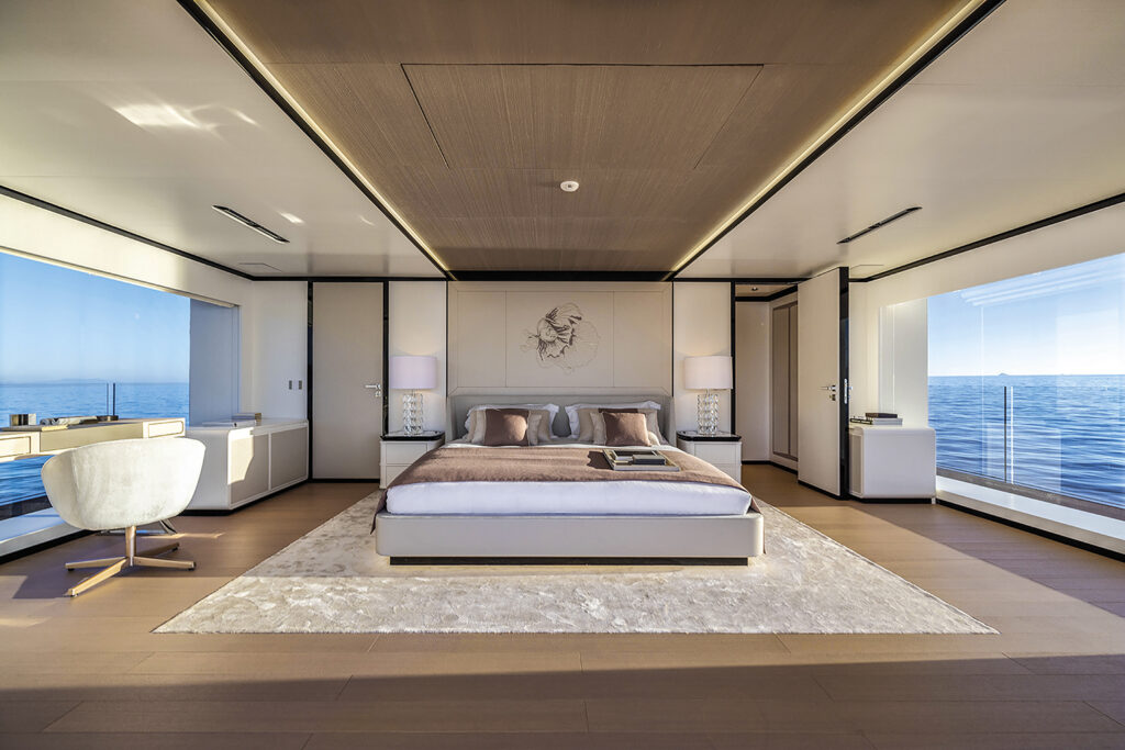 The falling flight of stairs leaving the lobby is flanked by a wall entirely clothed with Studioart leather, geometrically decorated. On the yard-proposed version, the main deck leads on to the owner’s suite and its special entrance dressing. The highlight here is an electrically powered folding balcony, for the owners to enjoy a sense of owning the sea around them.