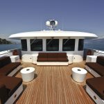 It is a boat where what predominates is the linearity of its form, connected on the exterior by roundnesses that prevent it from becoming angular, on the interior by the characterization of the entire furnishings that make a classical essence modern, for yachting par excellence, like teak, a material that is the leitmotif of the fitting out, and also for everything concerning the cladding of the bulkheads and of the floorings.