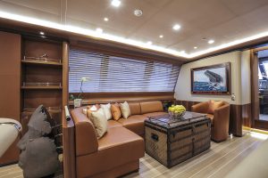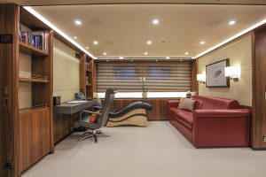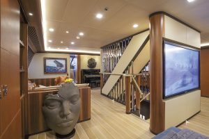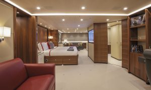 The stern offers a bathing platform as well as a swimming pool on deck forward of the mast set across offering plenty of opportunities to enjoy both the sea and deck pool. There’s plenty of room in which to store things also via a lateral opening to port which crew can use to board and disembark, which can also be deployed to house water toys and tenders of course. Two 6.20 metre tenders lodge on deck forward of the pool in encased slots which close flush with the deck. The carbon built tenders built by Constellation Tender on Roger Martin and Robbie Doyle design are capable of reaching 60 knots. One of them sports a hybrid propulsion system. Between the two encased tender slots there’s a pop up hydraulic davit crane which also enters into its slot closed over by a “flush” hatch on deck.