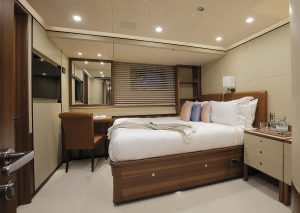 Perseus^3 in addition to twin wheels (port and starboard) sports two rudder blades as well which are controlled by an innovative Perini built system which can disengage one of them according to sailing angle, wind strength and sea conditions. The results obtained are certainly encouraging when we think that during the first set of trials with a mere 8 knots of apparent wind at a sailing angle of 40° Perseus^3 was cruising silently at 9 knots thereby demonstrating she’s fast like a thoroughbred, with a remarkable pedigree and great potential. Her owner who’d previously owned a Perini 50 Perseus, now Silencio while sailing around the world with his family thoroughly enjoyed cruising and also raced in the Hamilton Island Race Week events. They also chartered the yacht out and all of this will continue with Perseus^3, but naturally at other speeds. The permanent crew is made up of a captain and several high level expert seamen with plenty of experience in racing events as well as ocean crossings which are reassuring assets considering the size of the rig and sails involved. The interior layout has been designed by Perini’s in house design team to host charter parties as well which translates into five cabins, of which one with convertible beds from single to double and the other way round for a total of 12 guests. The owner’s suite runs full beam across and can be divided up by a removable bulkhead.