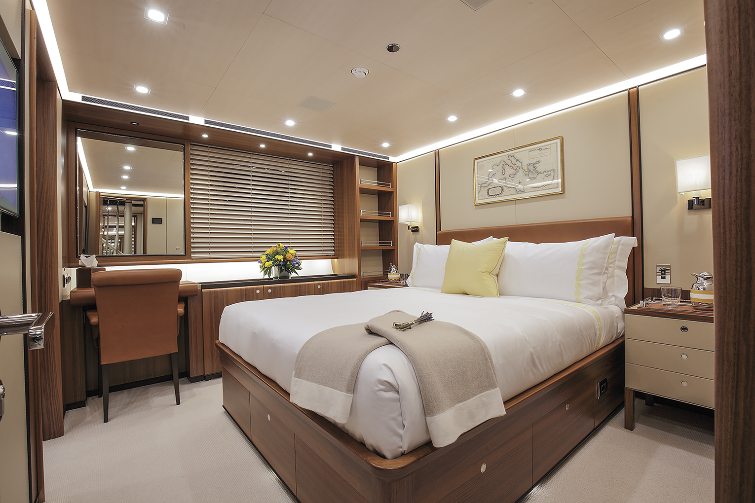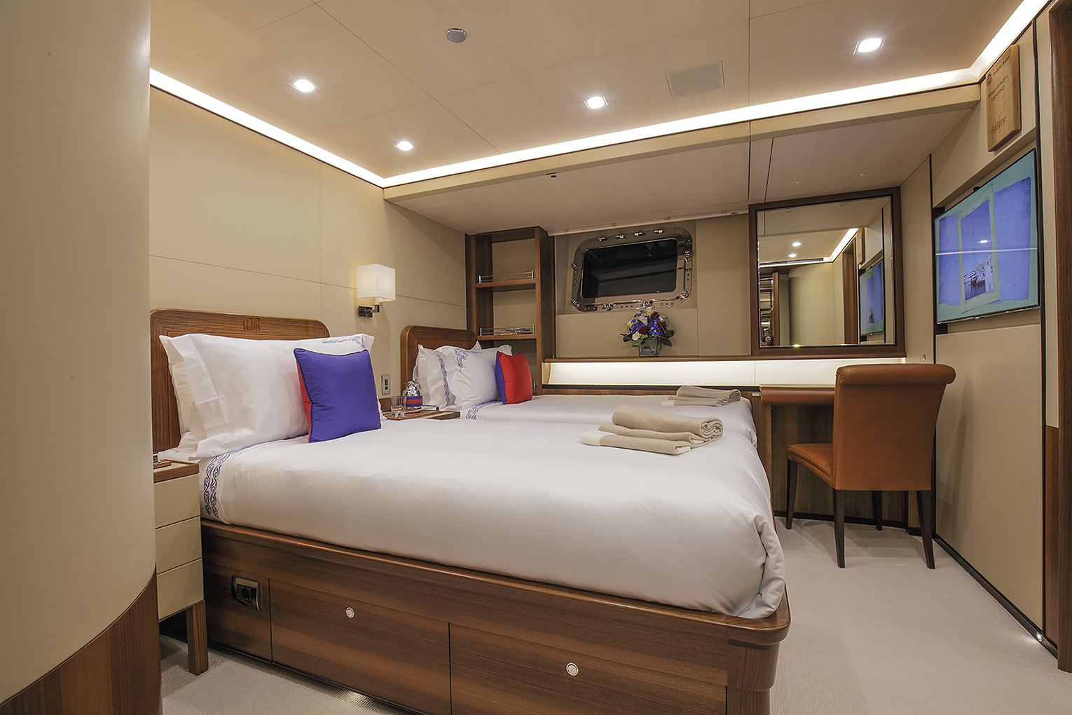 Perseus^3 in addition to twin wheels (port and starboard) sports two rudder blades as well which are controlled by an innovative Perini built system which can disengage one of them according to sailing angle, wind strength and sea conditions. The results obtained are certainly encouraging when we think that during the first set of trials with a mere 8 knots of apparent wind at a sailing angle of 40° Perseus^3 was cruising silently at 9 knots thereby demonstrating she’s fast like a thoroughbred, with a remarkable pedigree and great potential. Her owner who’d previously owned a Perini 50 Perseus, now Silencio while sailing around the world with his family thoroughly enjoyed cruising and also raced in the Hamilton Island Race Week events. They also chartered the yacht out and all of this will continue with Perseus^3, but naturally at other speeds. The permanent crew is made up of a captain and several high level expert seamen with plenty of experience in racing events as well as ocean crossings which are reassuring assets considering the size of the rig and sails involved. The interior layout has been designed by Perini’s in house design team to host charter parties as well which translates into five cabins, of which one with convertible beds from single to double and the other way round for a total of 12 guests. The owner’s suite runs full beam across and can be divided up by a removable bulkhead.