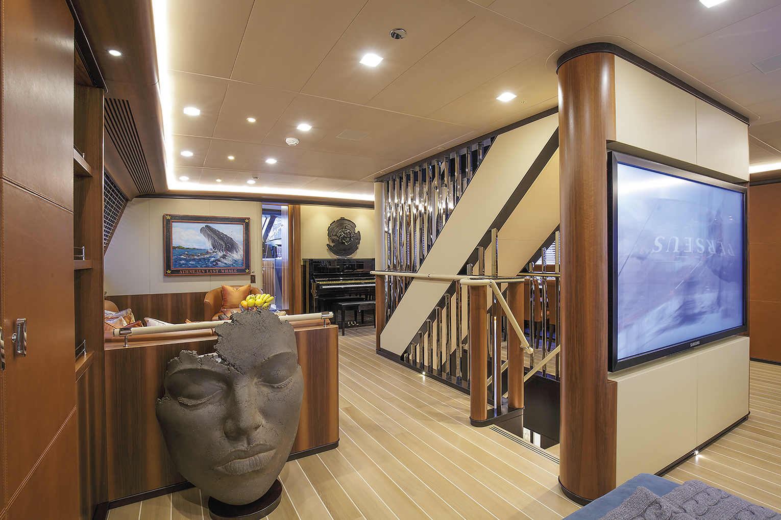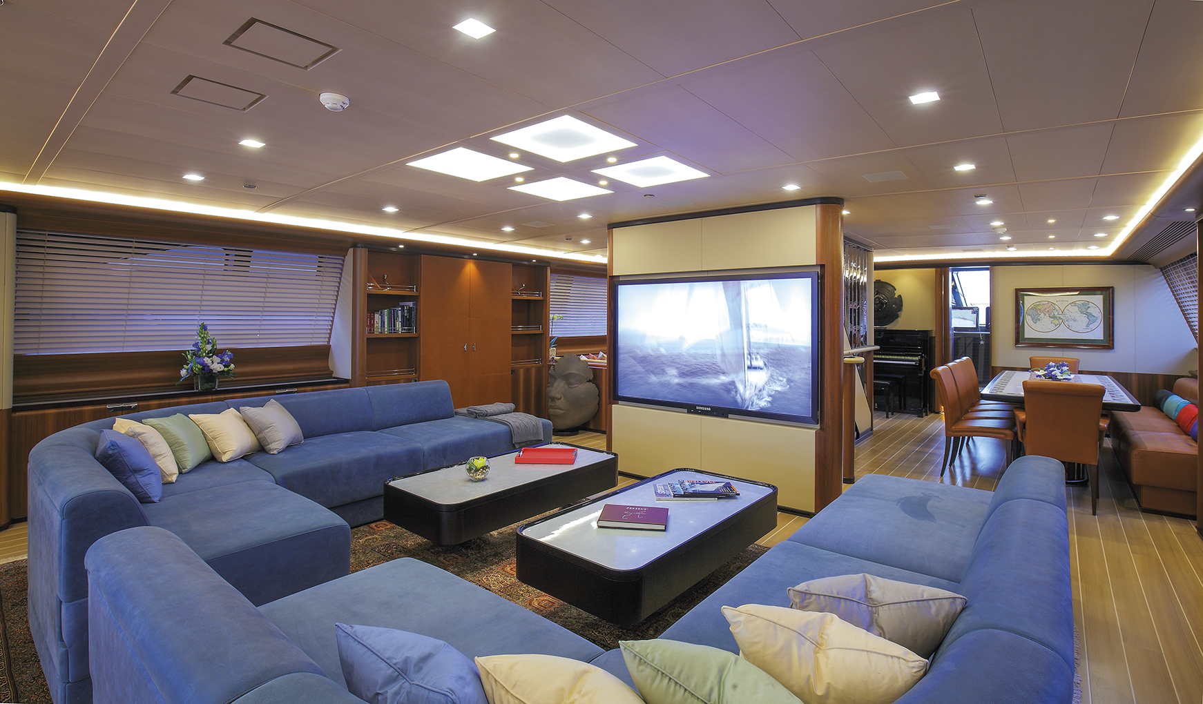 Perseus^3 is a very fast yacht but at the same time it can double as an ideal charter boat, because of the amazing layout, an unbelievable owner’s suite, a gigantic fly-bridge and a pool equipped with a wave simulation system in which you swim against the water jets. The pool water can also be heated thanks to a water recycling system inside tanks installed below the pool which heat the water up accordingly and when needed the tanks are emptied to double as immense lockers for the gigantic spinnaker and MPS. The engine room hosts a pair of MTU diesels for a total 1,440 KW (1,958 hp) and three Northern Lights generator sets for a total 270 KW which charge an ample set of lithium batteries which allow to run the yacht on batteries alone for half a day at a time to further enjoy, the sea, silence and pure sailing while cruising.The keel blade can vary draught from 12.30 metres to a mere 4.30 metres which means that Perseus^3 can cruise the Bahamas naturally, but cannot cross the Panama Canal because the mast is just too high to slip by under the bridge.