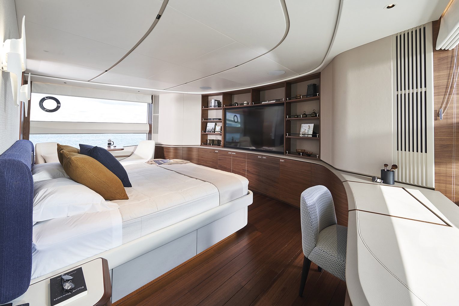 One of this yacht’s main features is space: both the fly version named Super Flybridge and the interiors of the main deck extend for nearly the whole lrngth of the yacht, registering a 10% to 40% accrued external and interior spaces when compared to a traditional yacht of the same size.