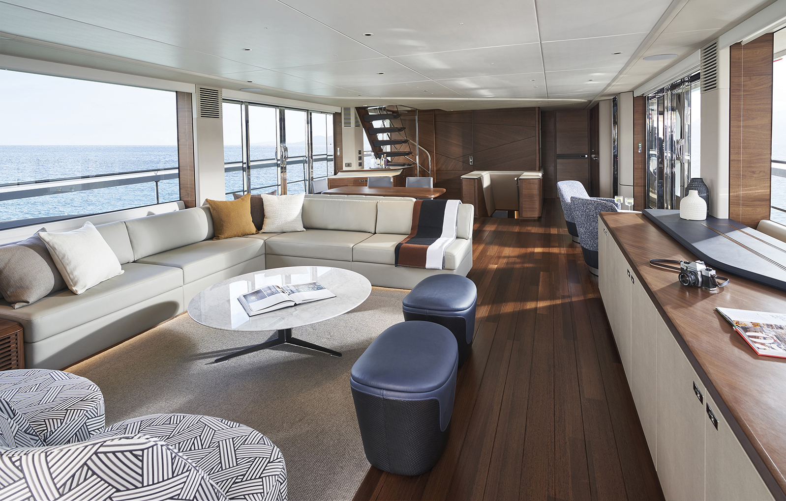 Since the interiors are flexible and versatile they can be easily adapted to be configured time after time to the necessities of the moment which can be for lively parties of visiting guests or maybe transformed into private areas and more. From whatever view point you look at this, it is thanks to the deck’s extension to the bow area measuring about 18 metres in length that lends itself to any configuration.