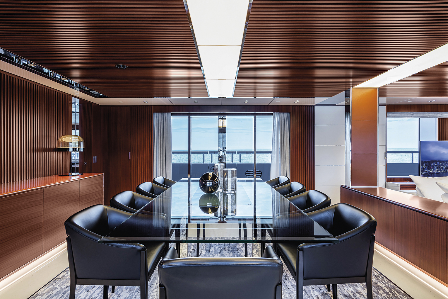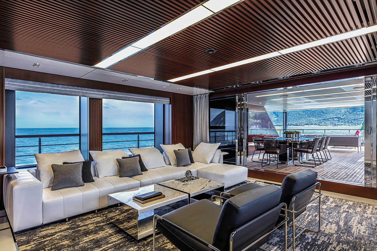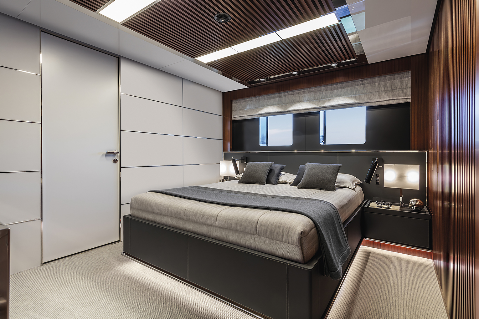 Liberal use of this precious essence is also found below decks where this wood’s dark colour prevails over other components in polished steel, leather and some of the furniture’s diverse grey hues as well as several other details such as precious carpets that are deployed to protect Apuan white marble flooring. The same stone essentially but of the statuarietto variety, enriches coffee table tops and lines bathroom walls with darker streaks which highlight the contrast with the furniture’s mahogany lining and lacquered grey finishes.