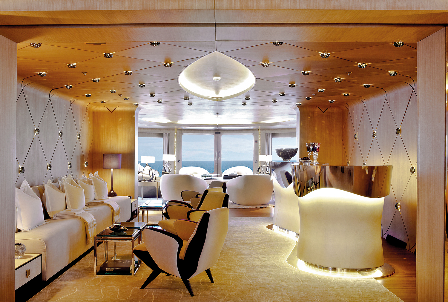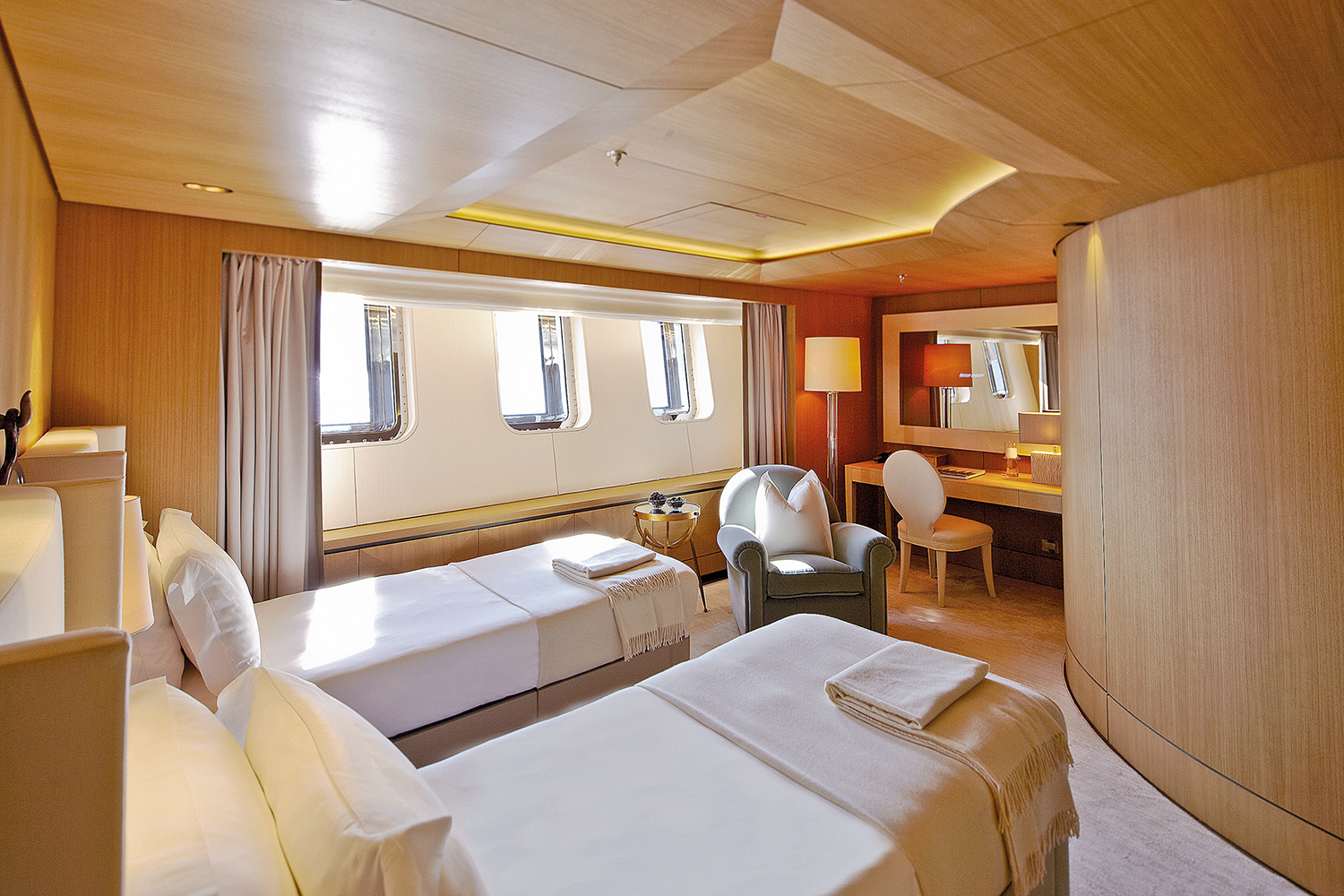 Every deck sports a different appeal which the architects have harmoniously blended together through a stylistic continuum where rice paper scrolls, galuchat, bronze and Murano glass objects have been wisely inserted to blend with natural materials that are chromatically different like ebony and teak are to marble and stone.