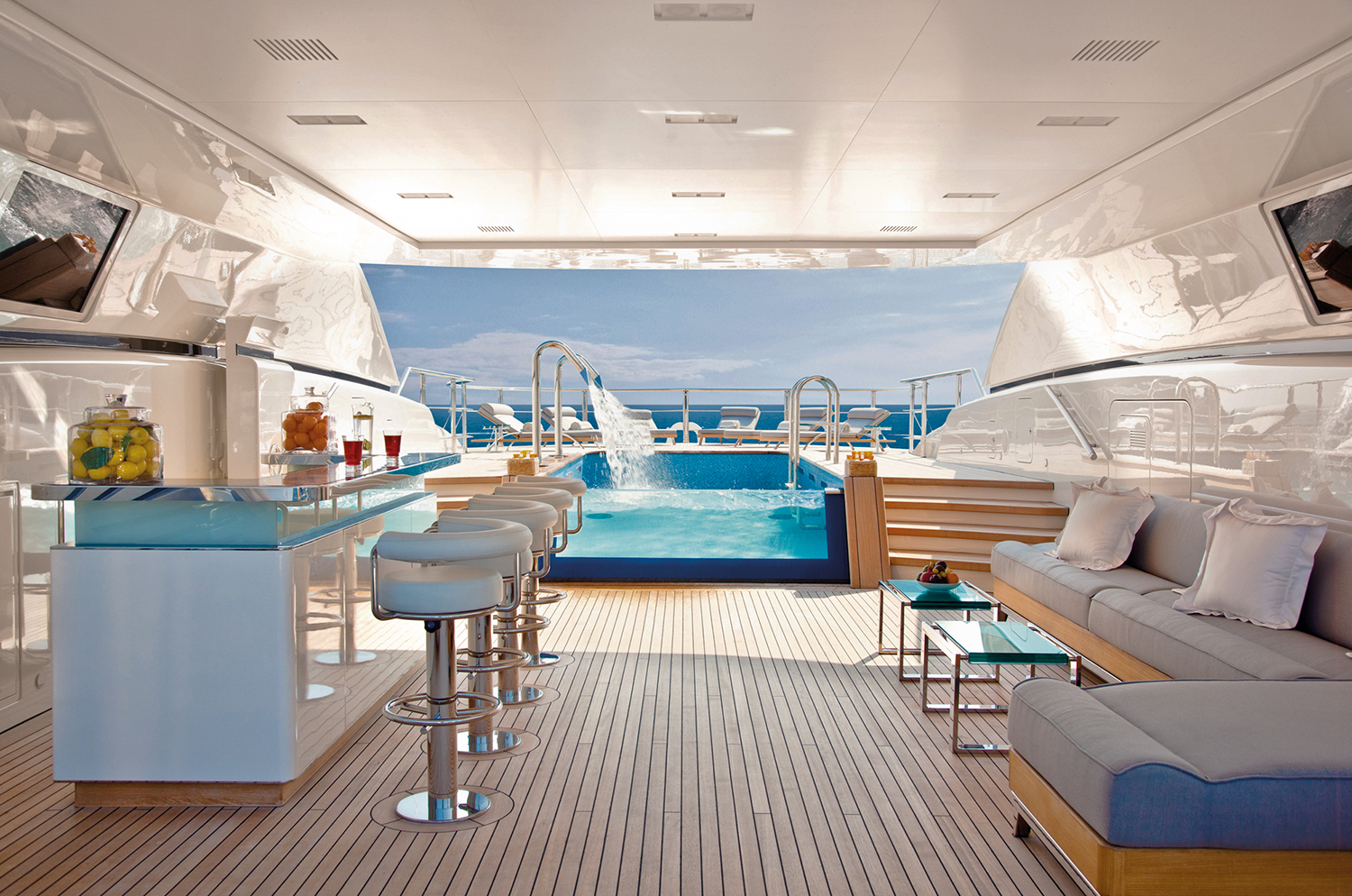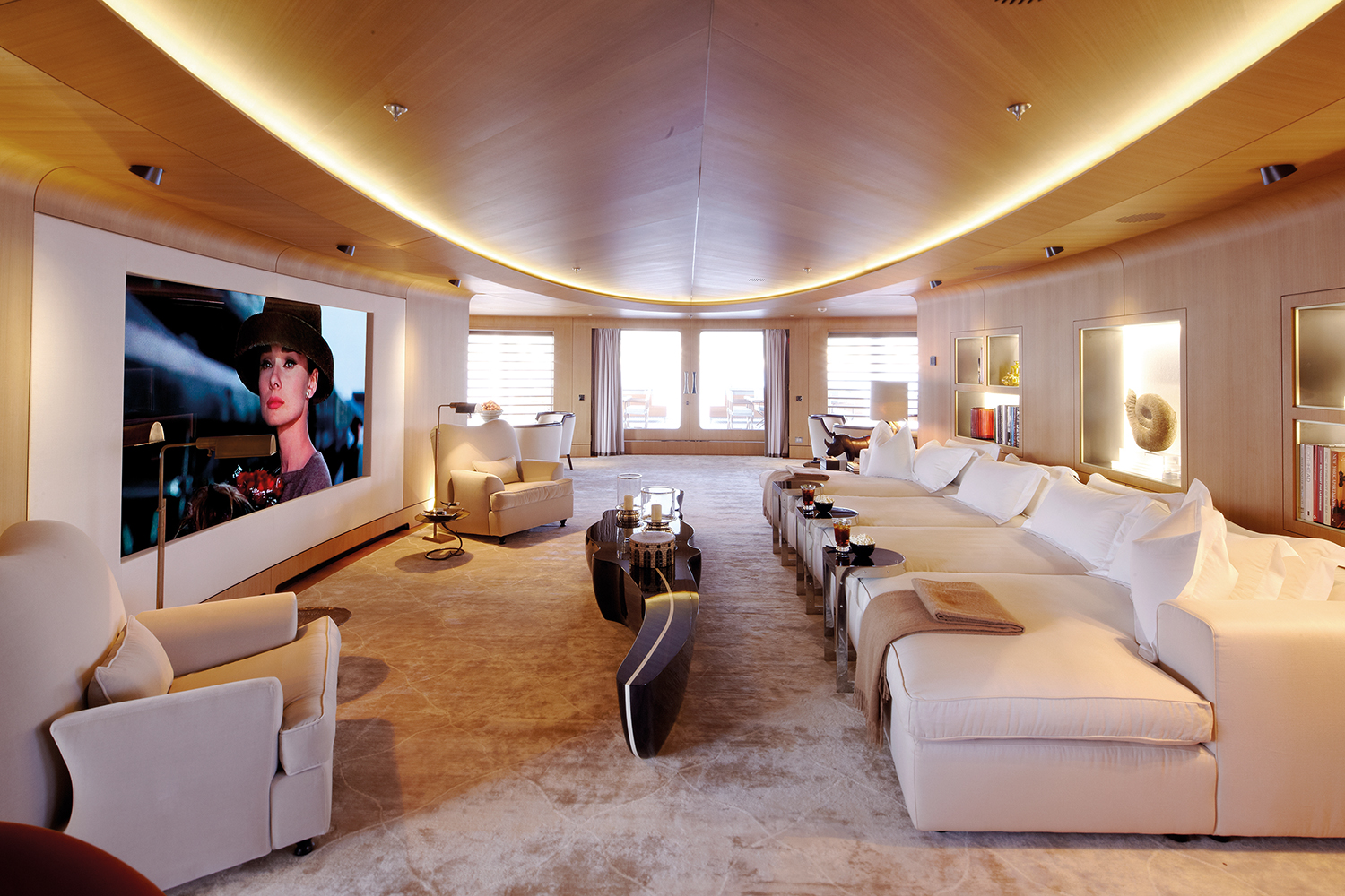 The furniture has been “tailor made” as per the owner’s wishes including embellishing seating arrangements for the saloons and the impressive media lounge in which to enjoy unforgettable moments watching films. There are many convivial areas in which to relax on board along the upper decks destined to day use, whereas the lower deck hosts the guests quarters as well as some of the crew’s. As normally happens the owner’s suite takes up most of the bow section of the main deck with plenty of natural light pouring in from large window panels and features a really amazing bathroom containing a stone sculptured bath tub which stands out in contrast with dark marble flooring.