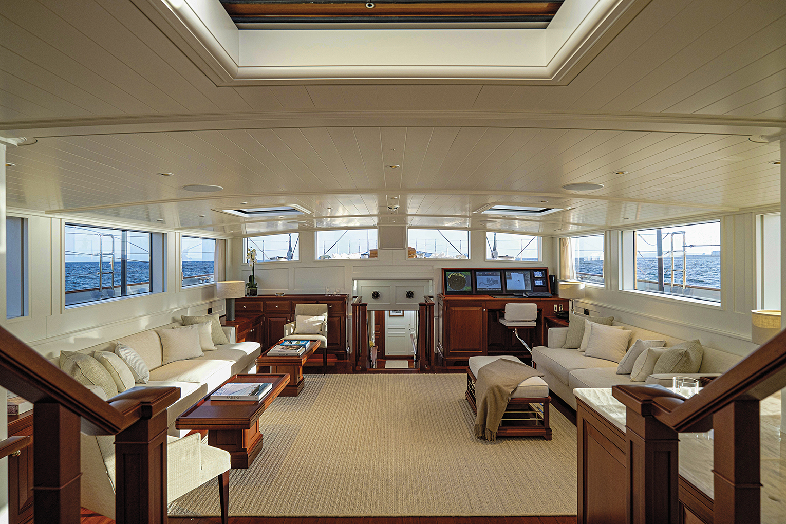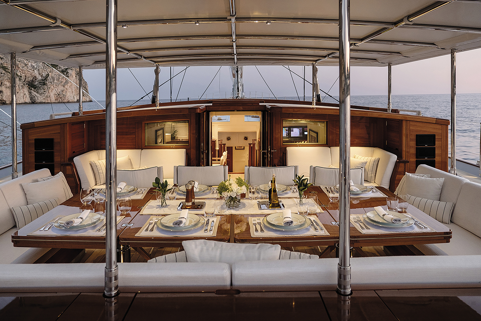 The deck’s layout comprises two compact deckhouses lined in teak with a smaller hatch forward to let the crew go about their work independently. Amidships there’s a lounge area in which to socialize and a well furnished main cockpit in which to enjoy luncheons and dinners.